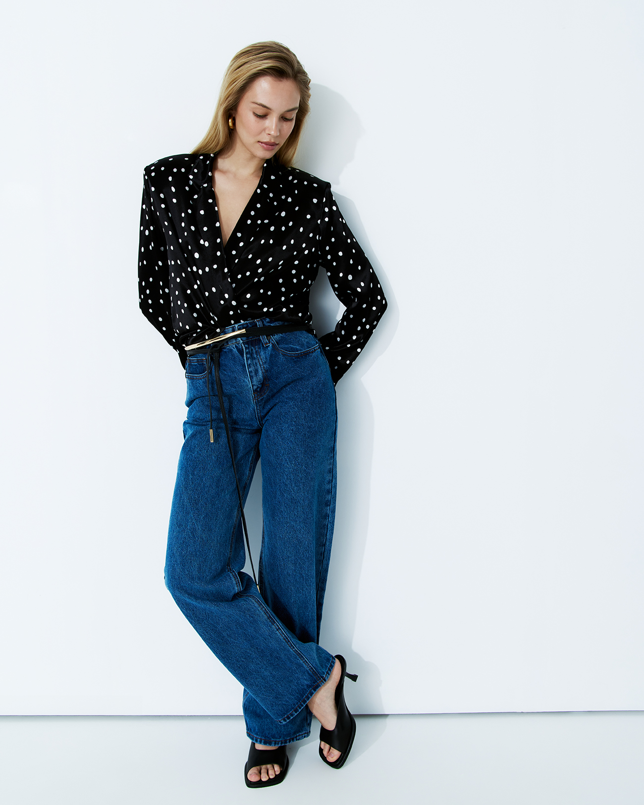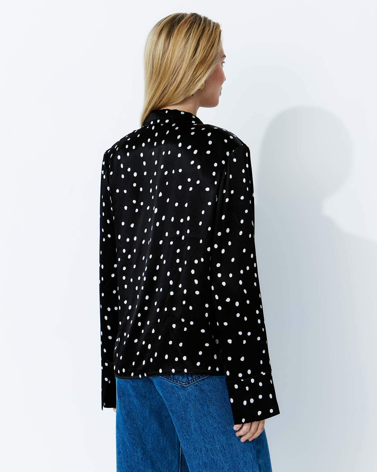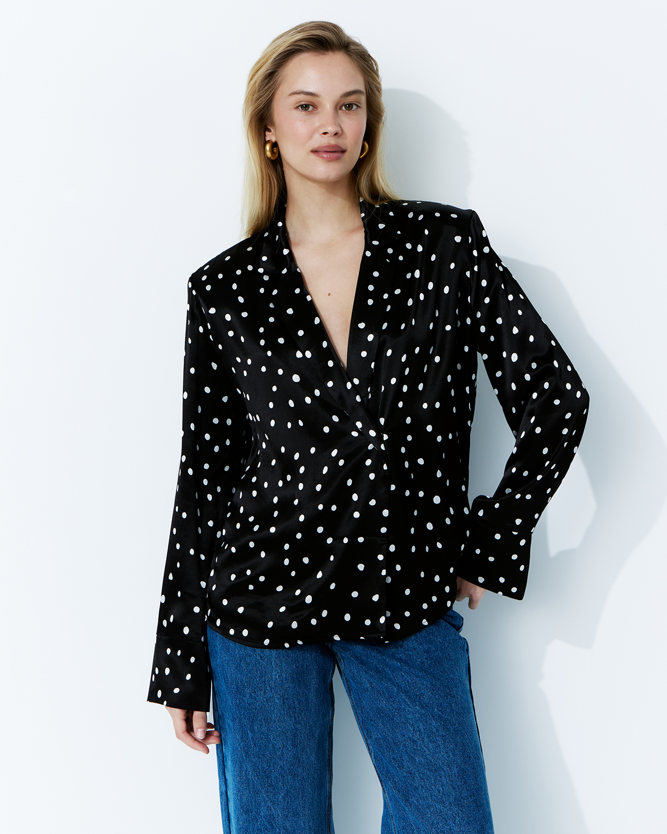 Блуза на запах в горох черного цвета