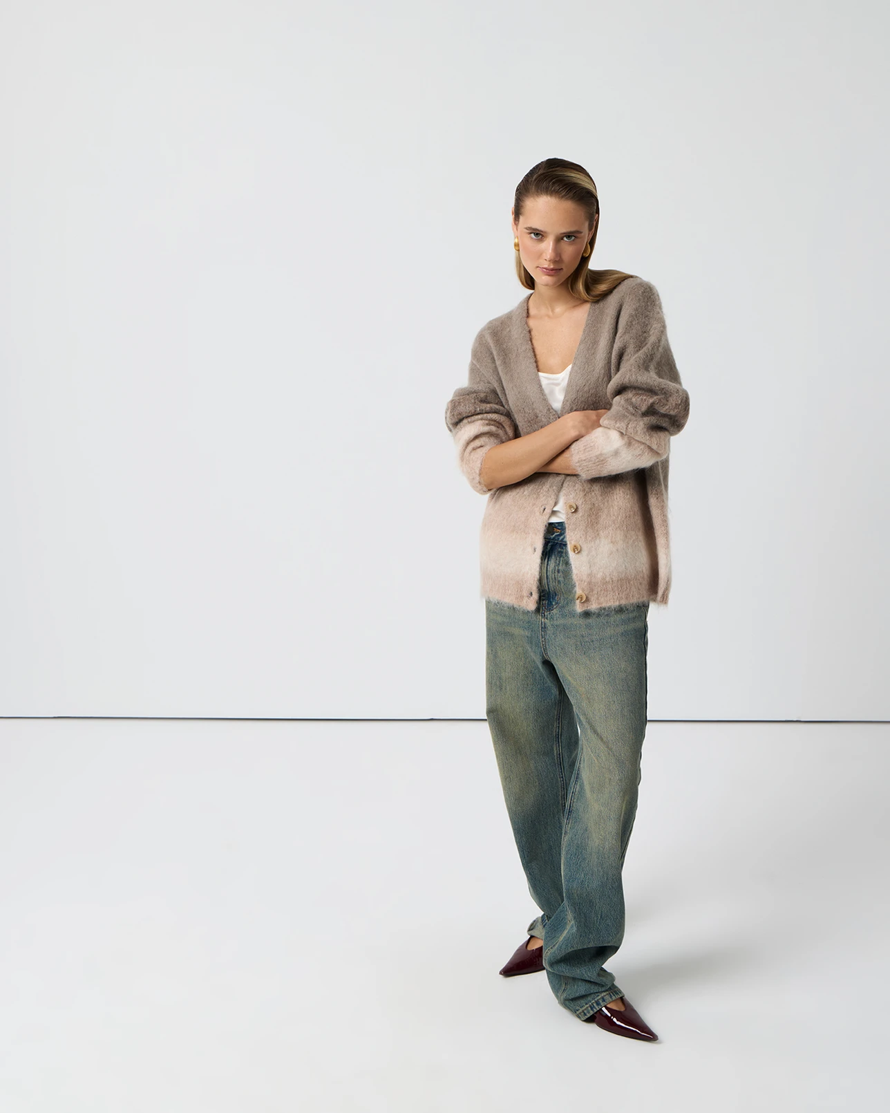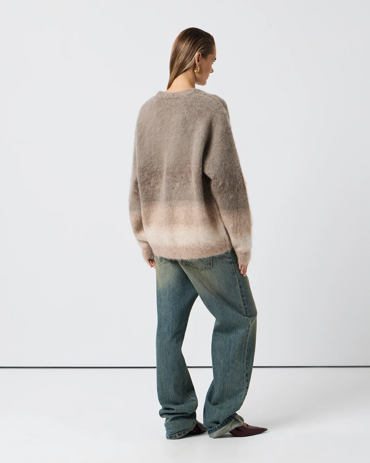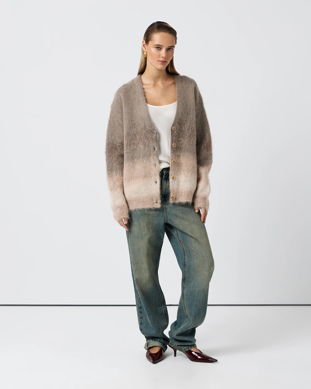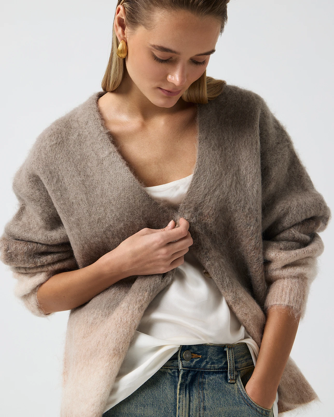 Кардиган пушистый с градиентом серо-бежевого цвета