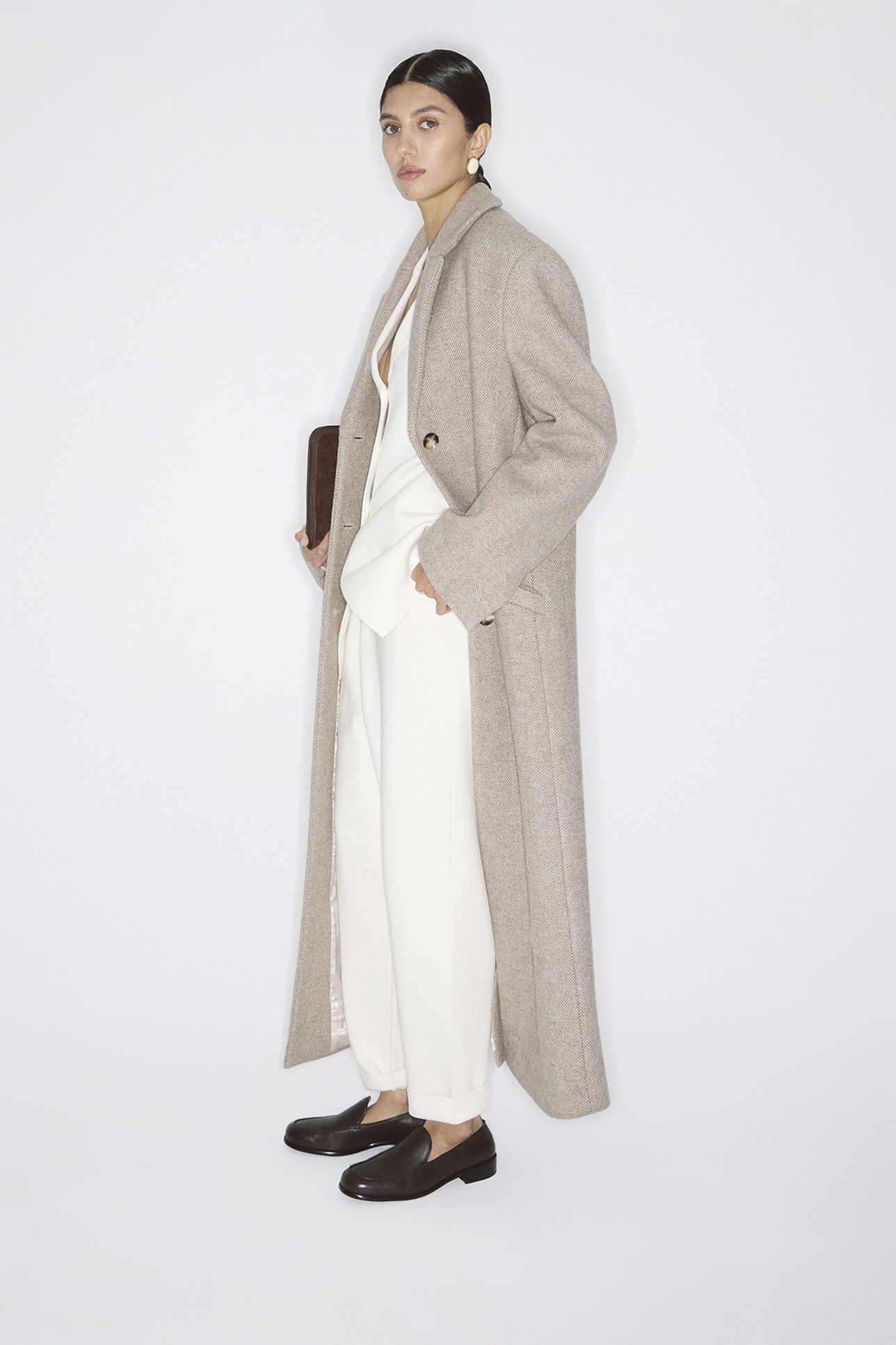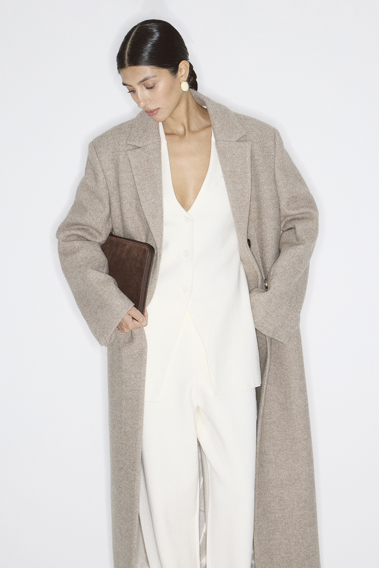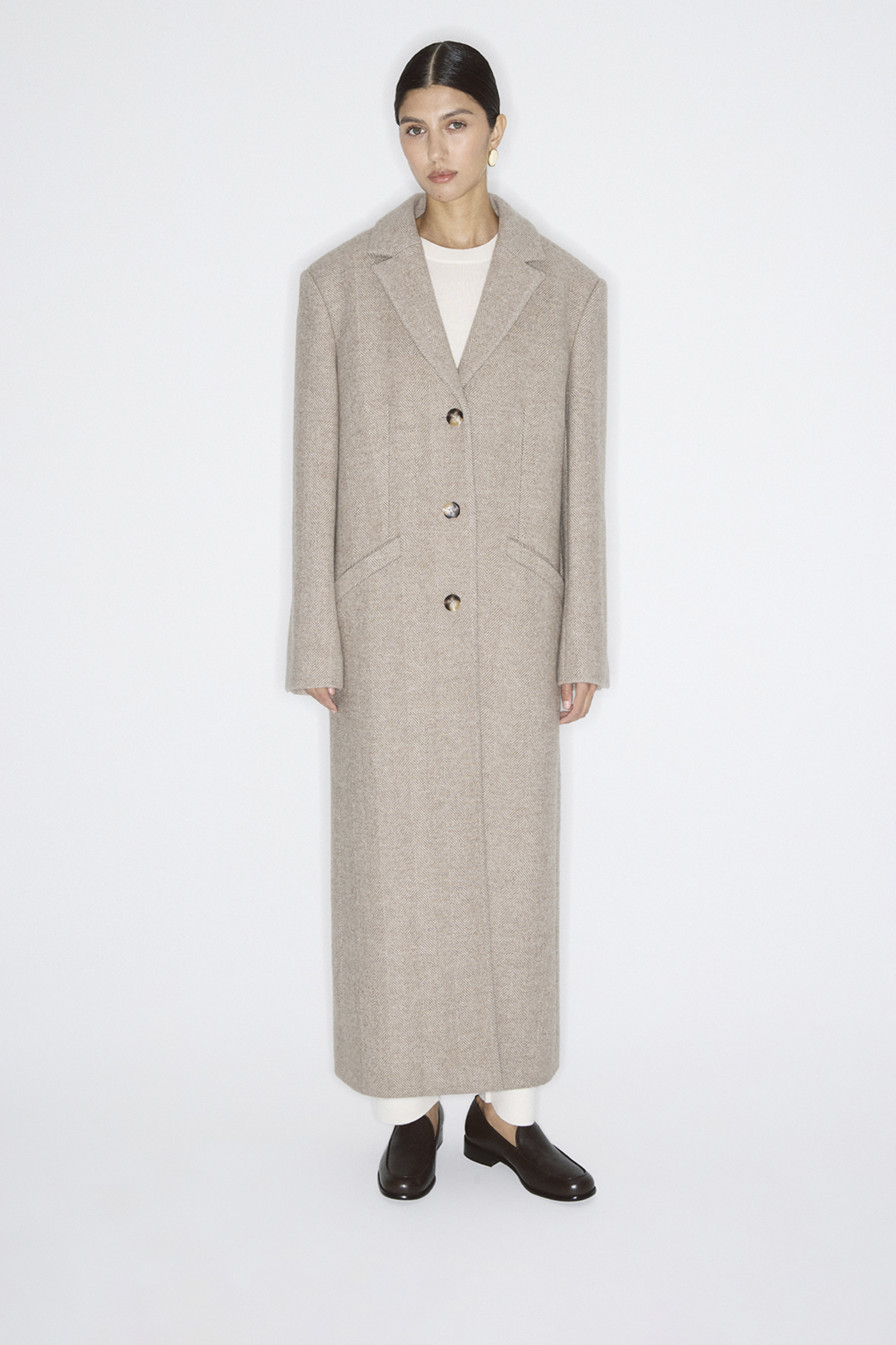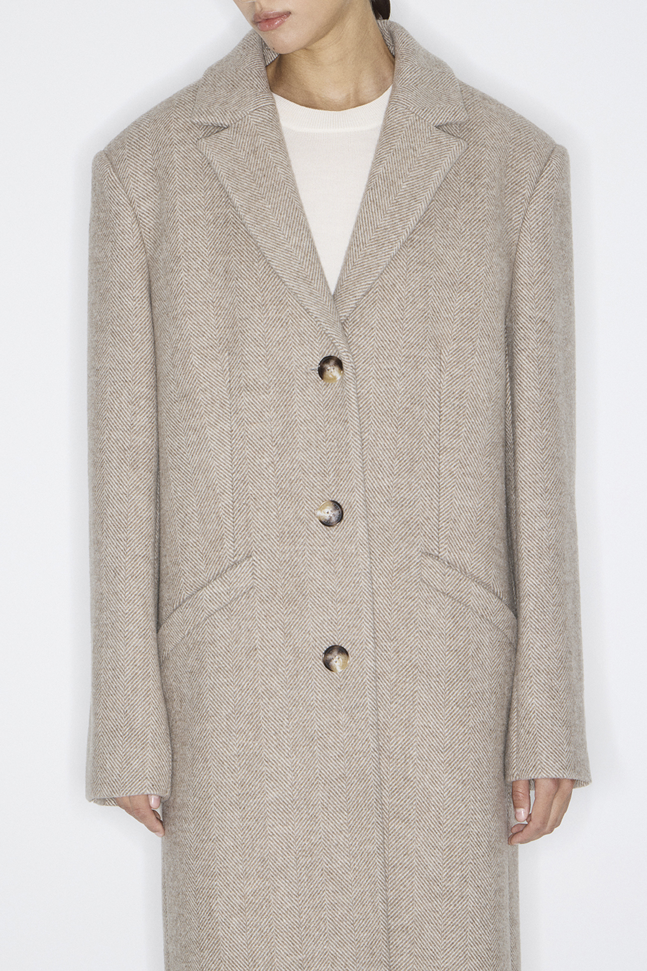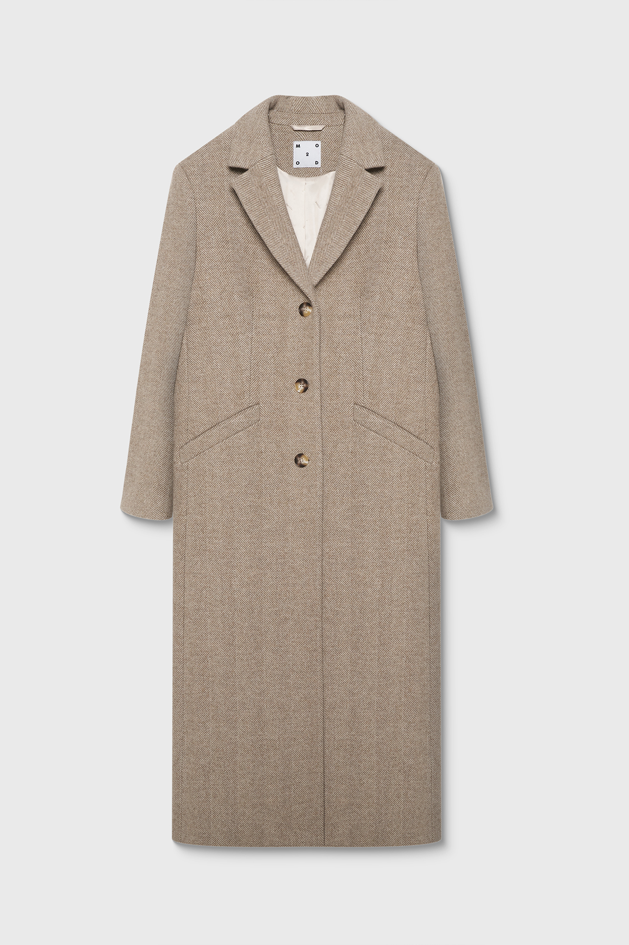 Пальто длинное из шерсти в елочку серо-бежевого цвета