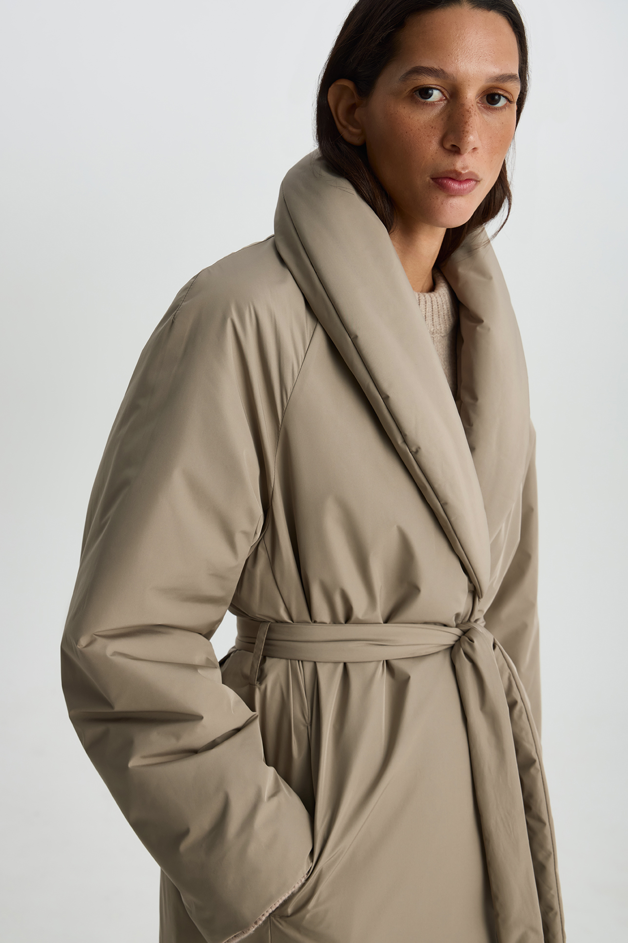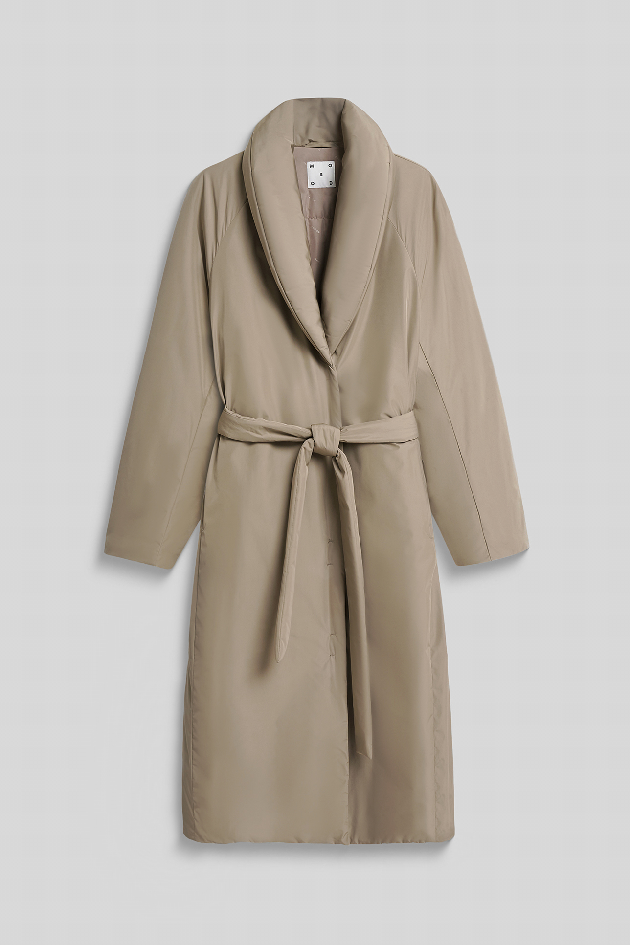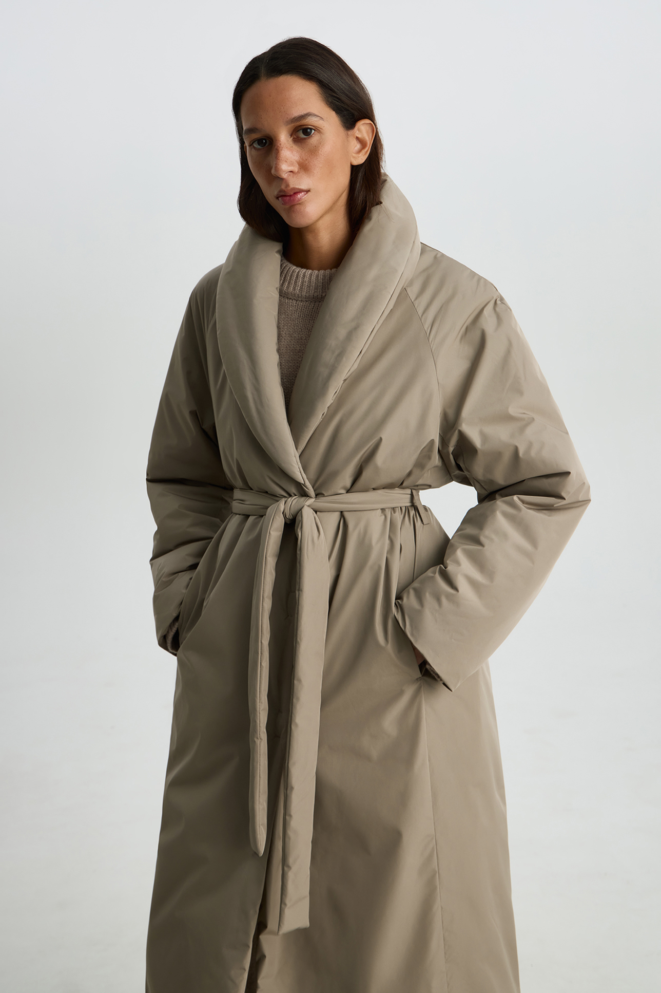Пальто утепленное серо-бежевого цвета