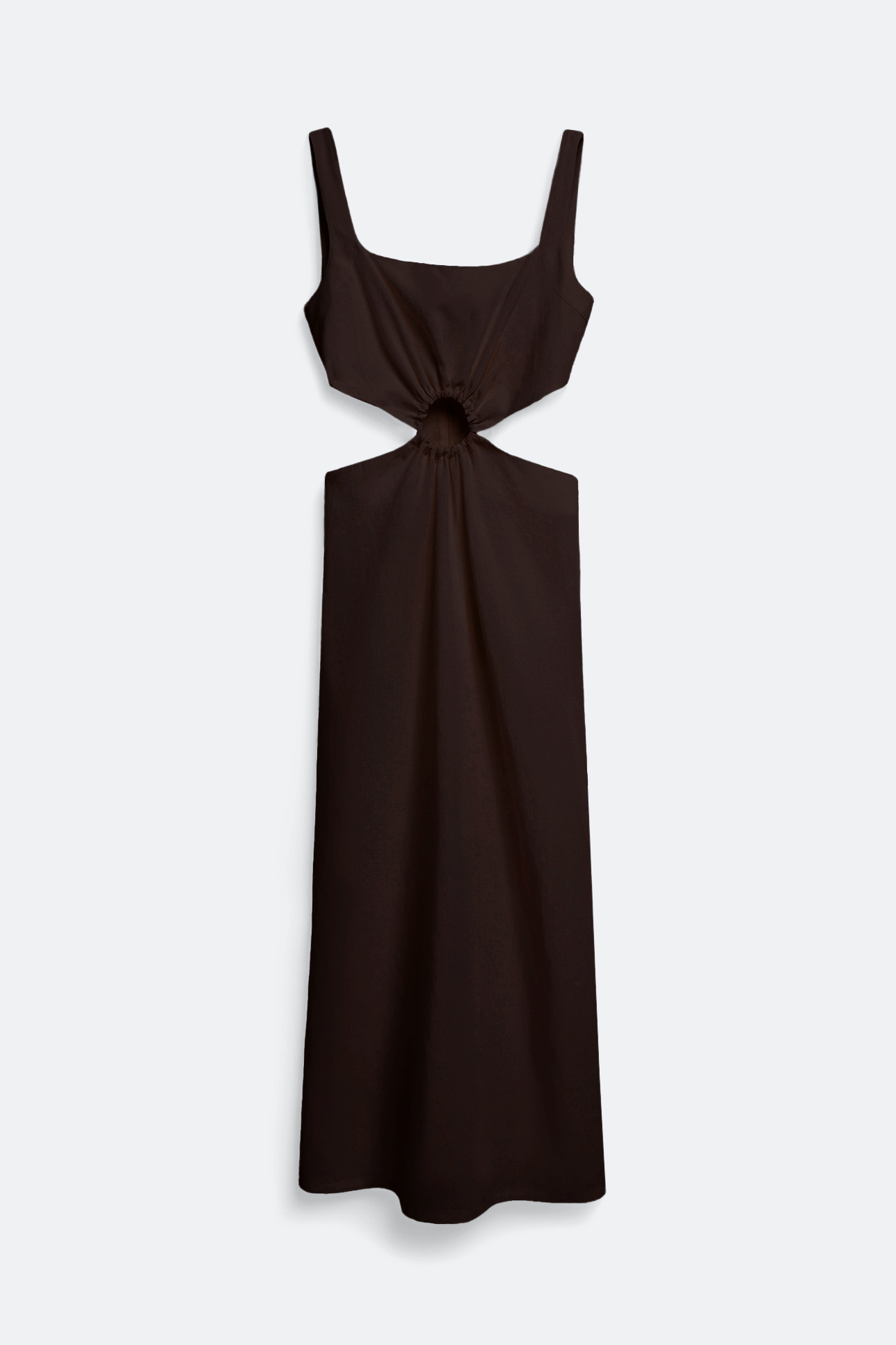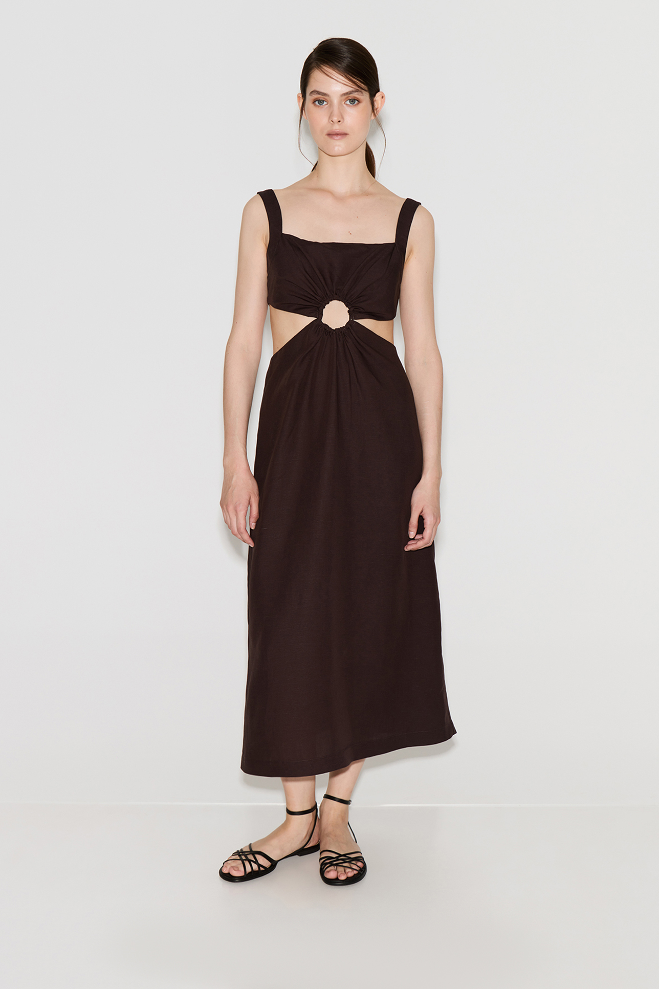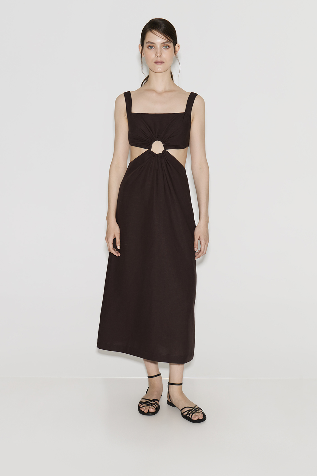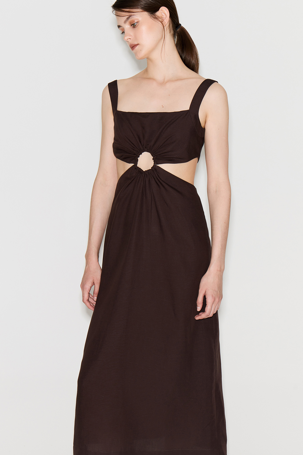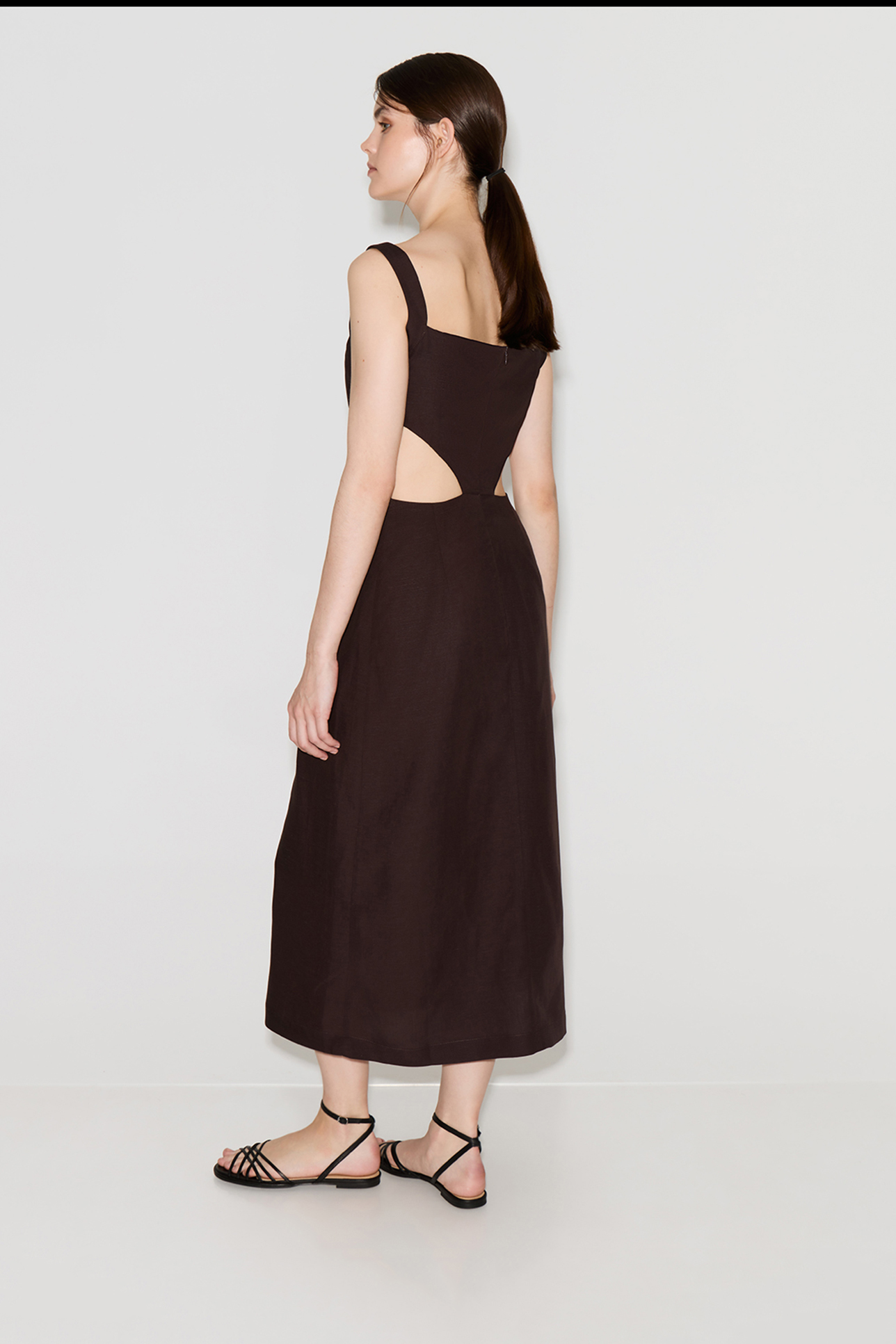 Платье миди со льном шоколадного цвета