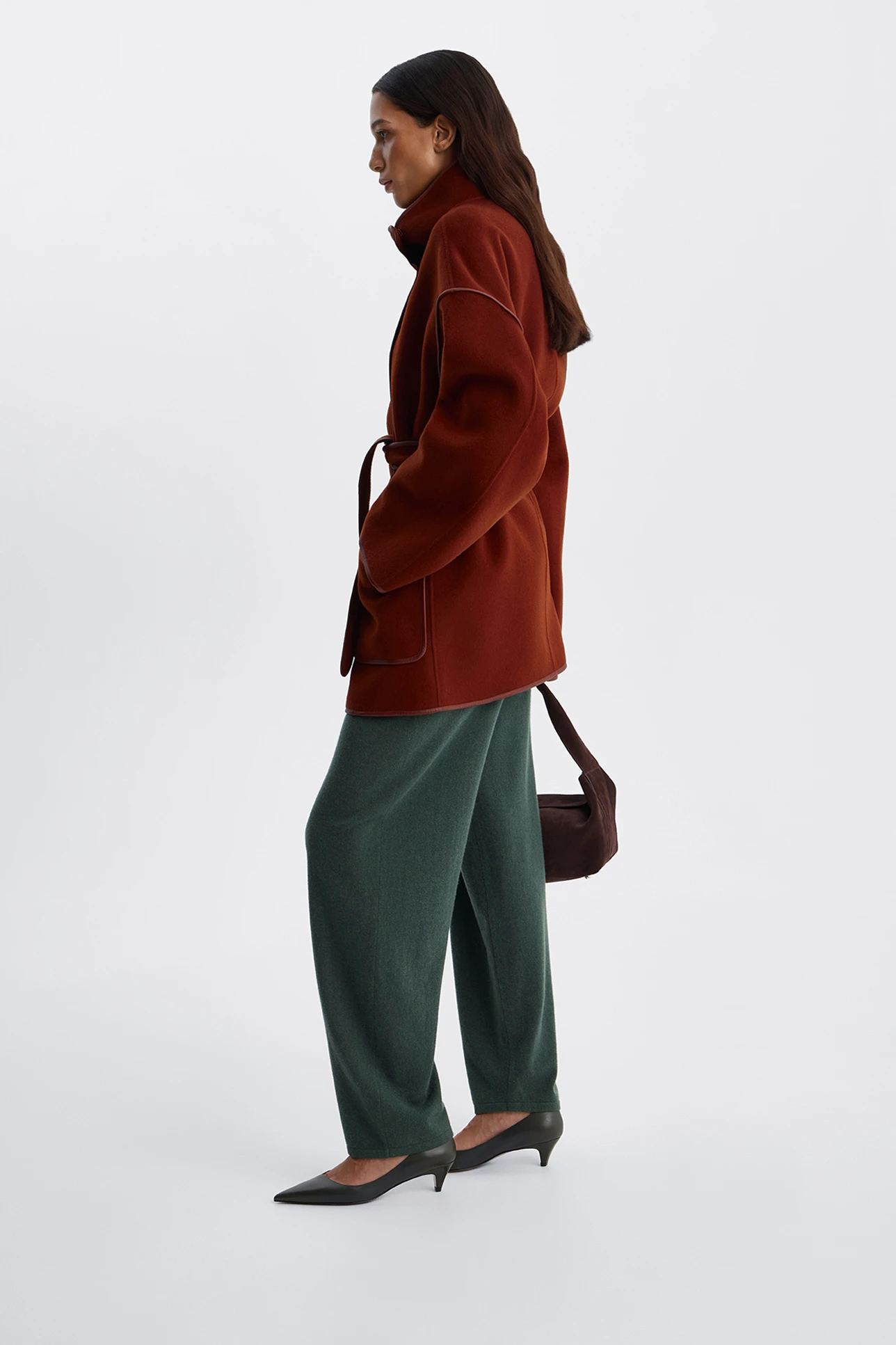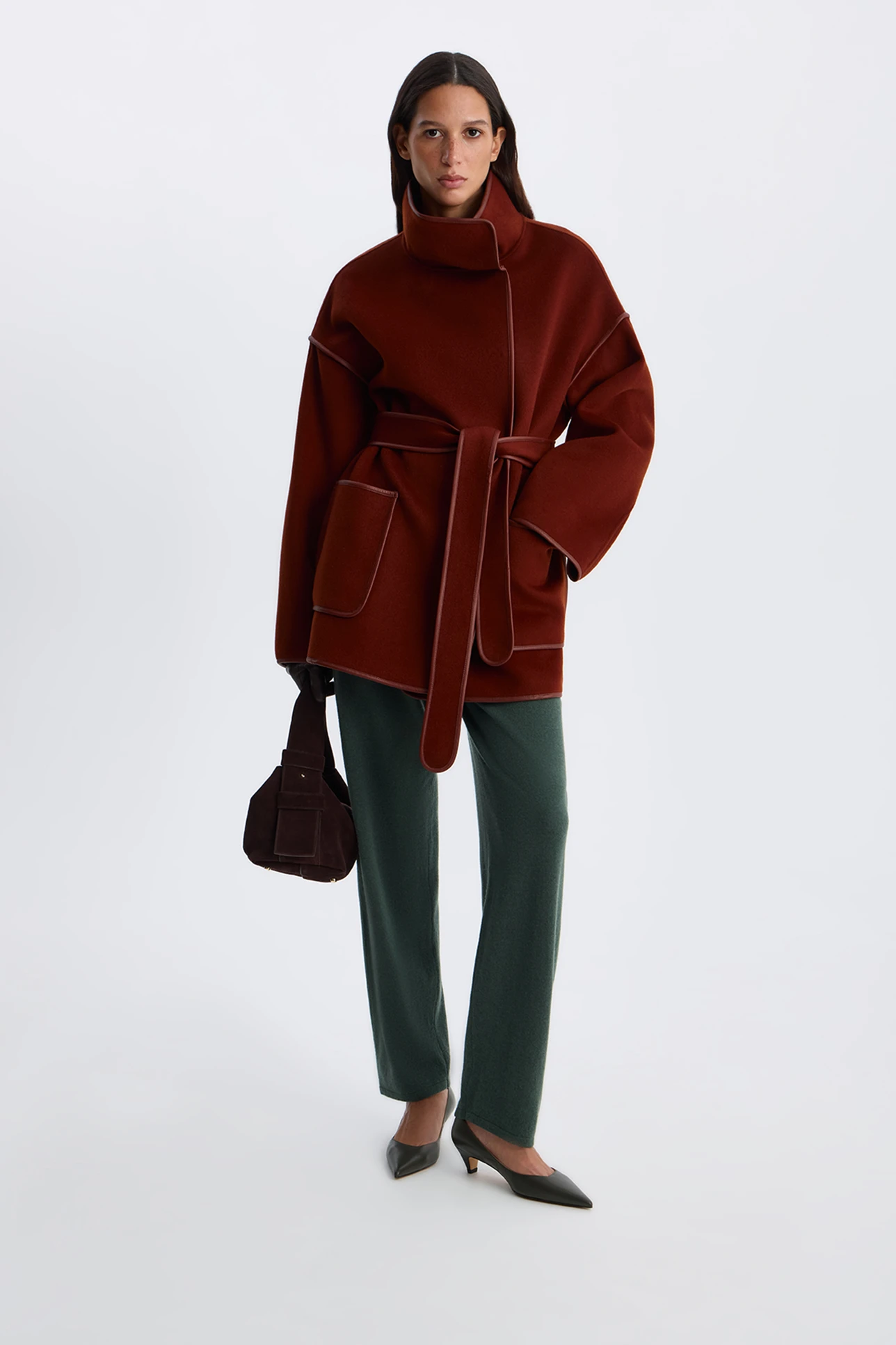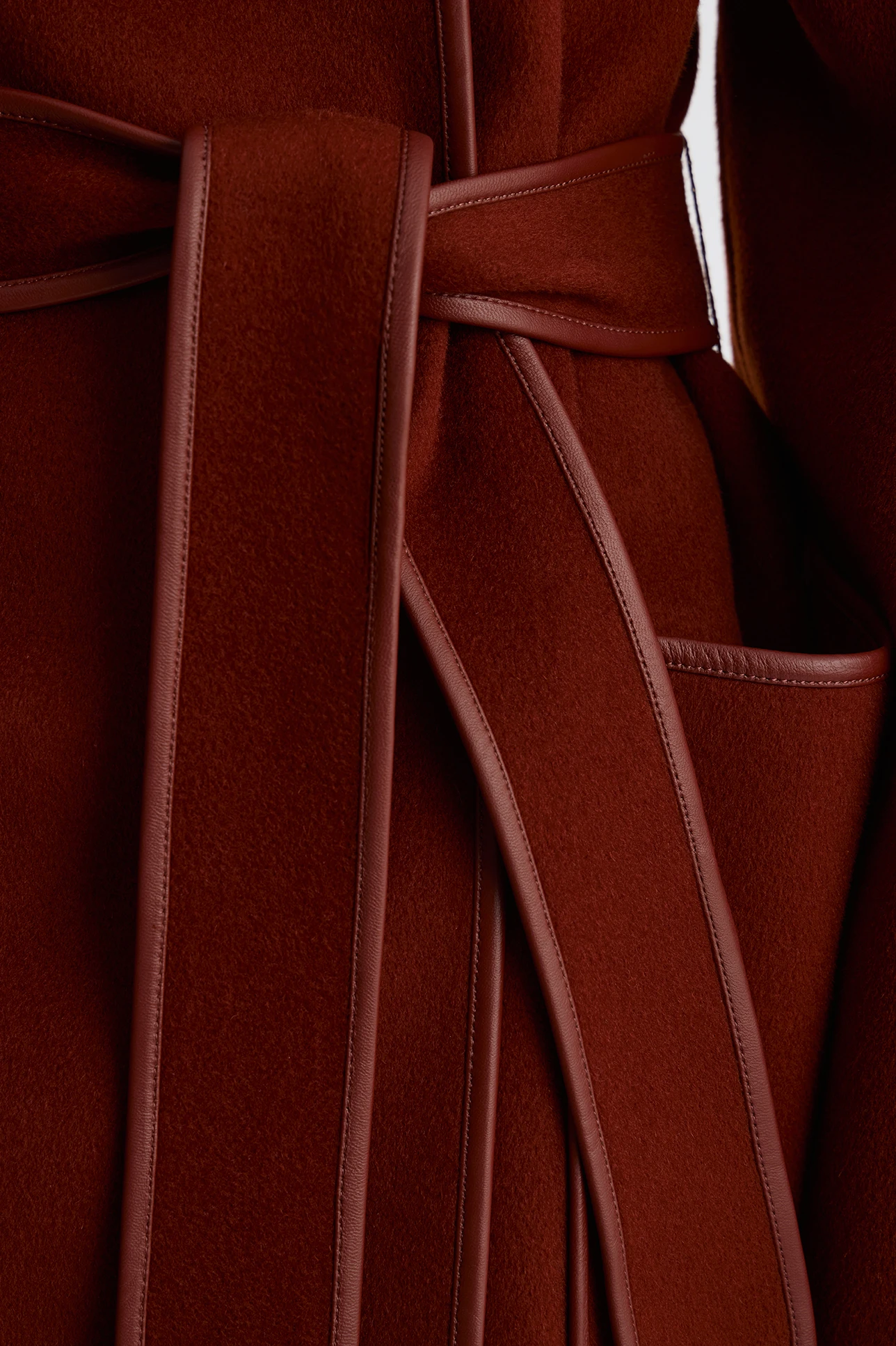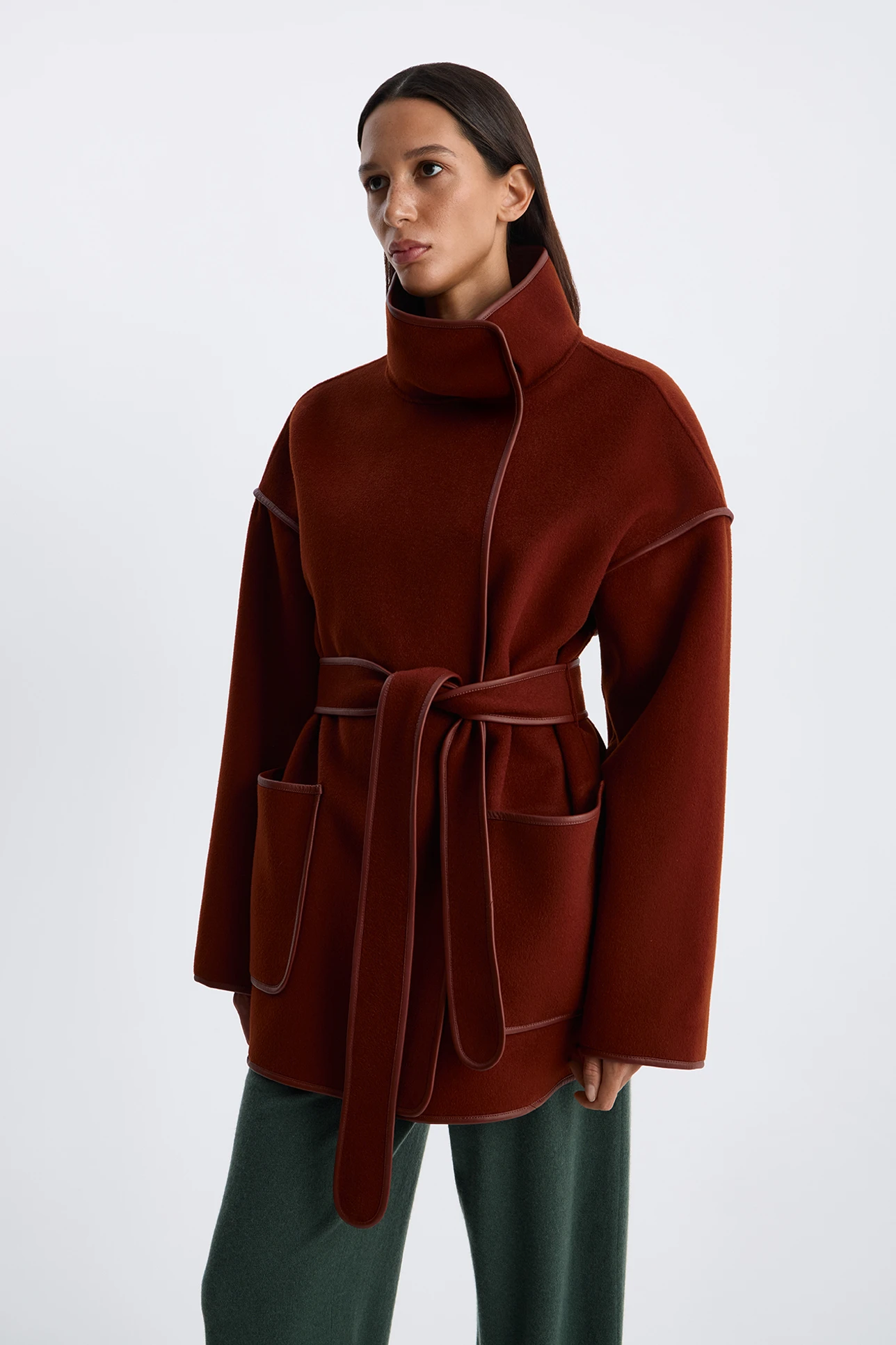 Полупальто с окантовкой из натуральной кожи терракотового цвета