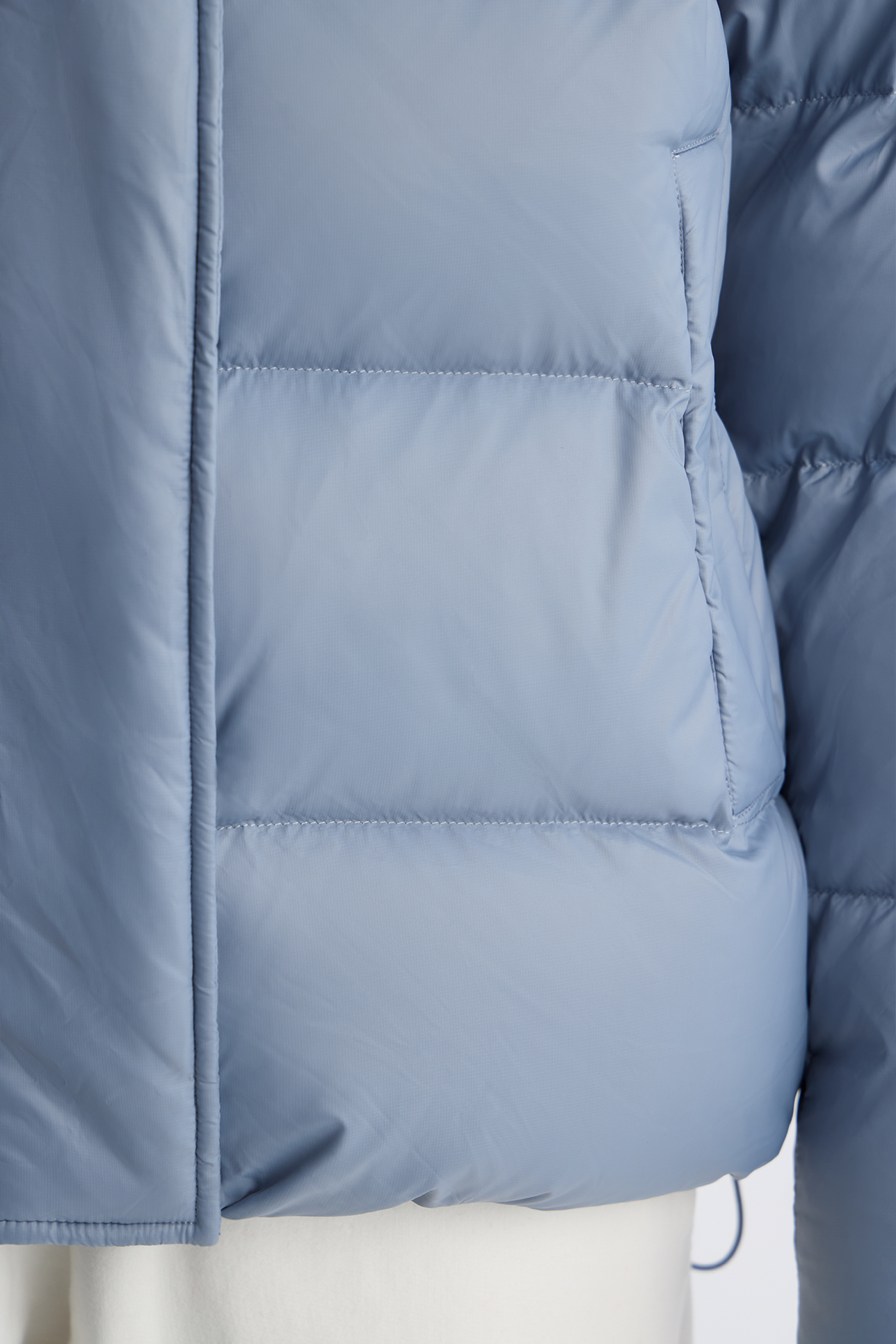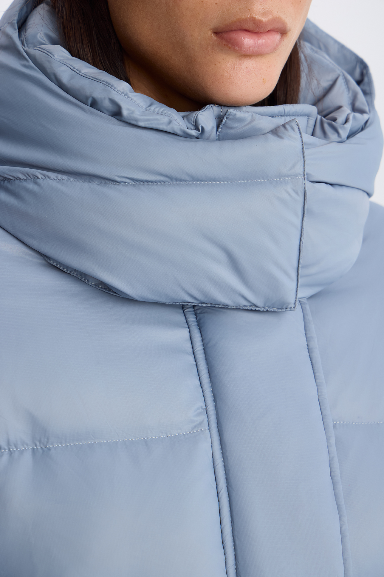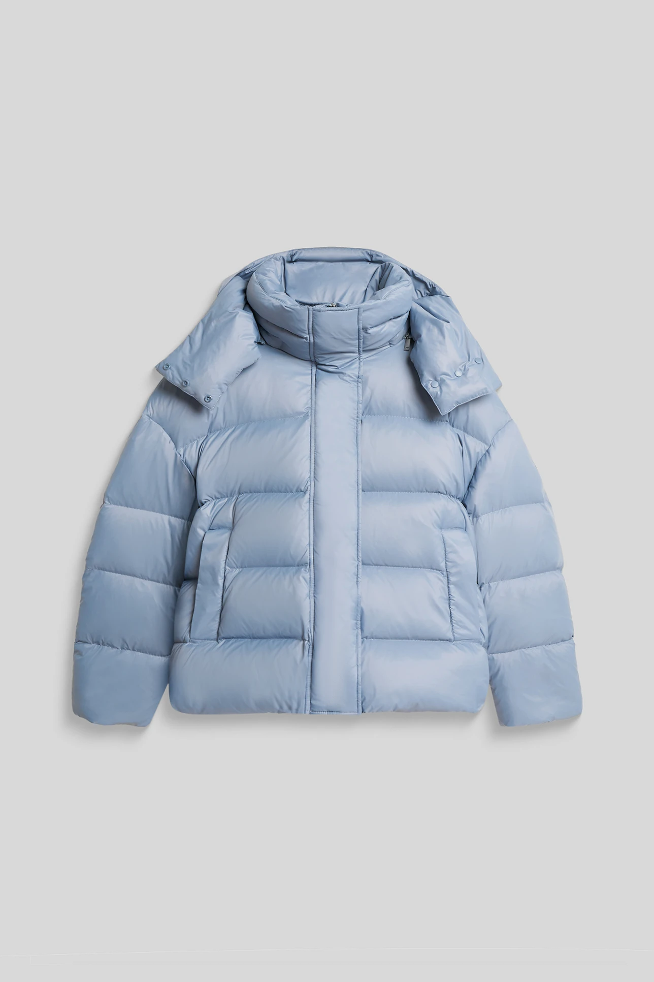 Пуховик с однотонным капюшоном серо-голубого цвета