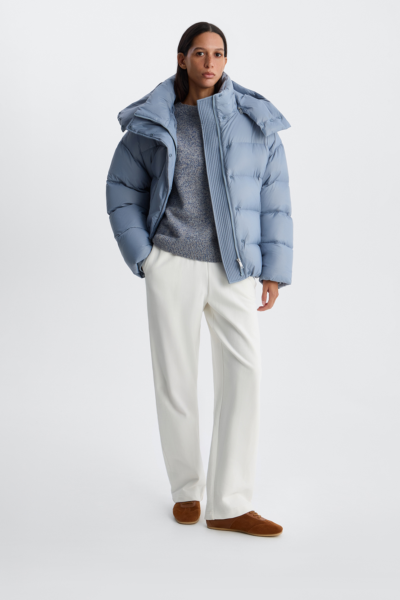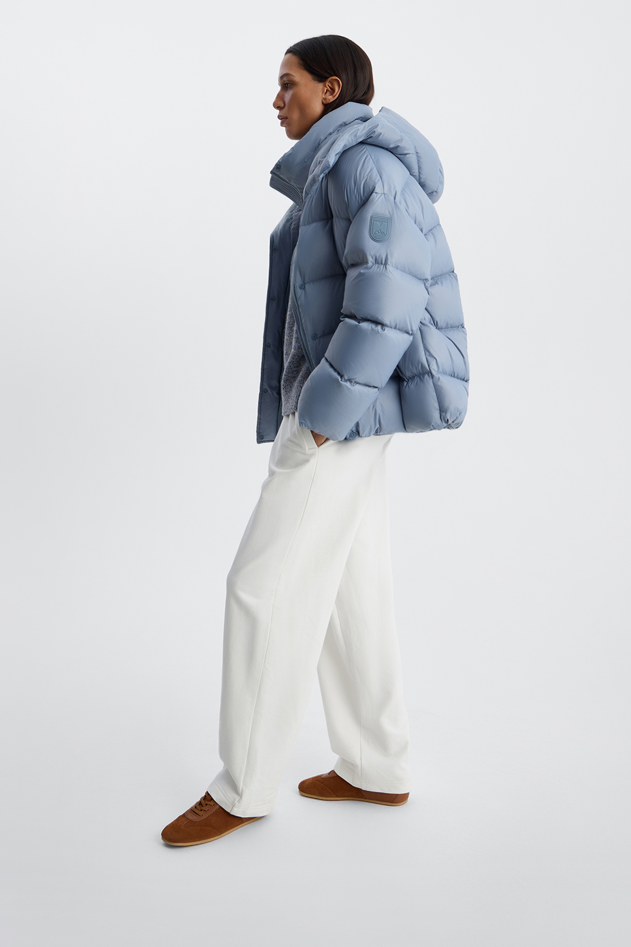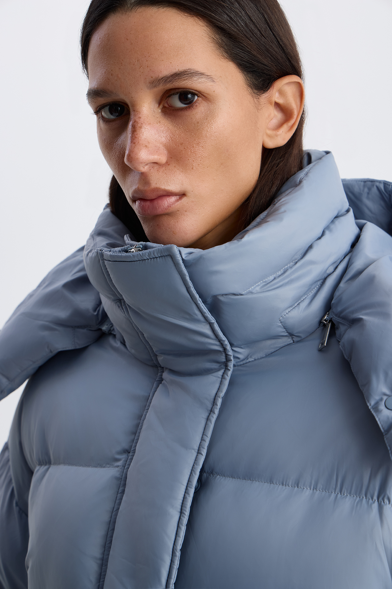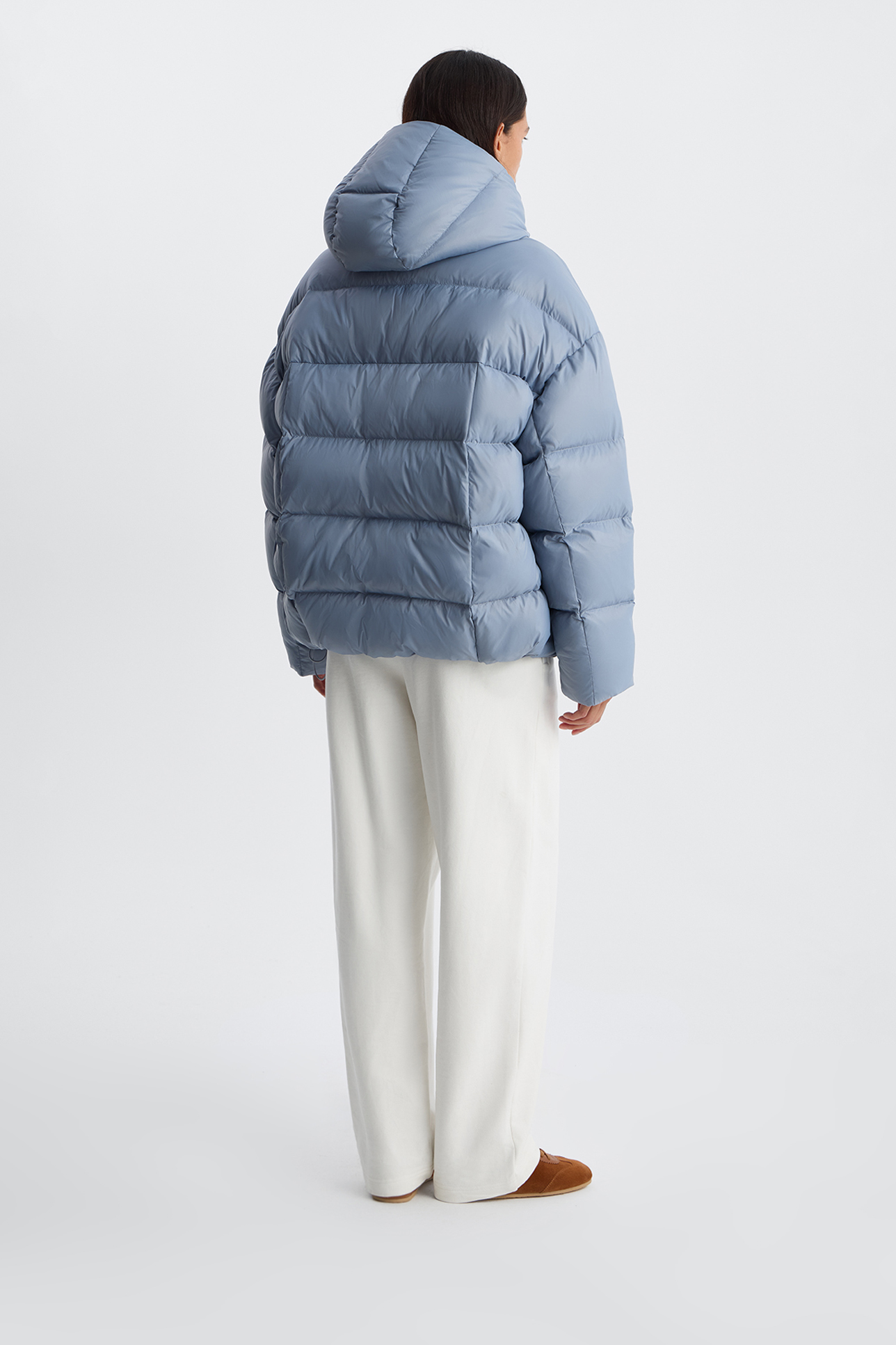 Пуховик с однотонным капюшоном серо-голубого цвета