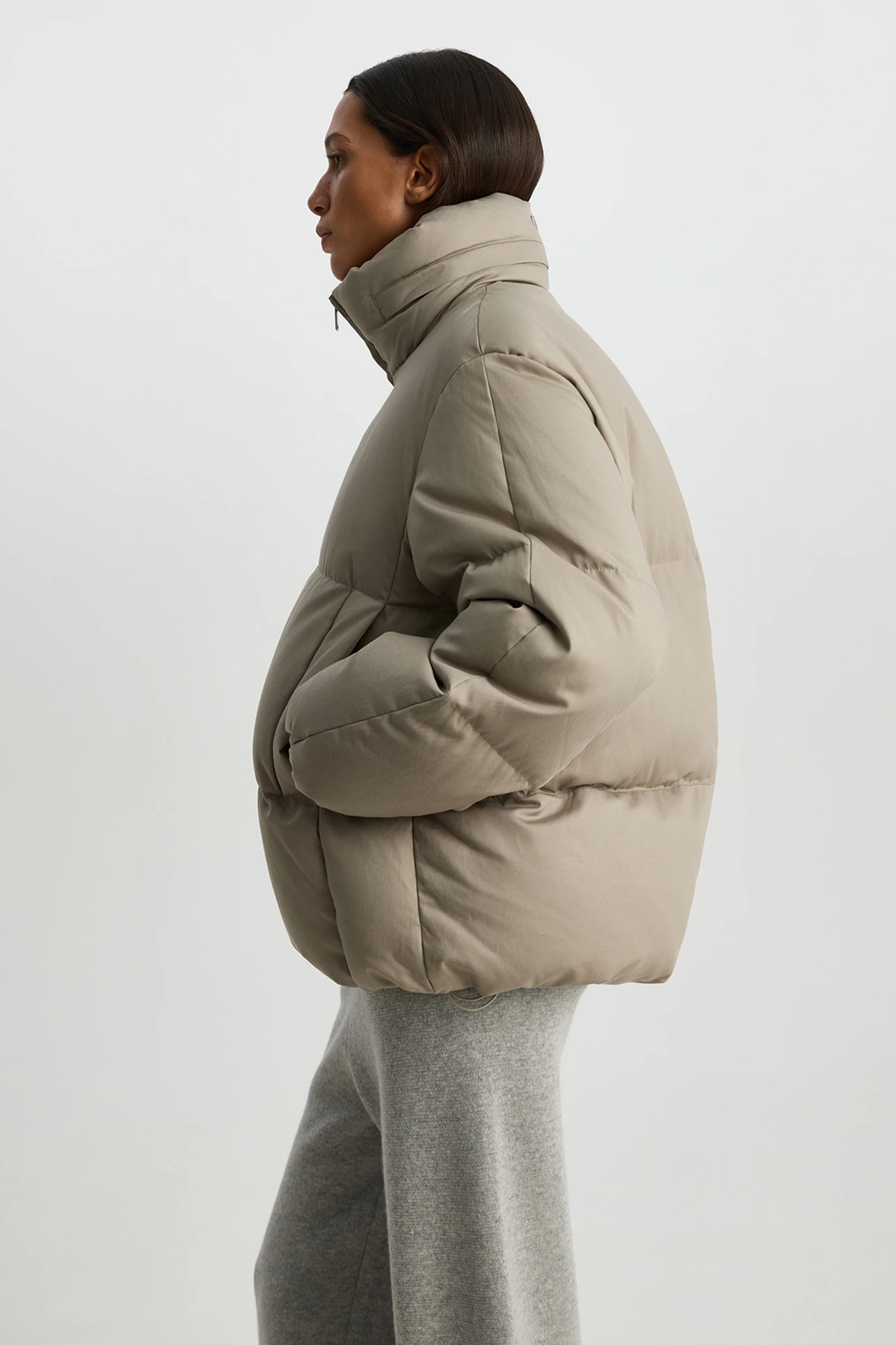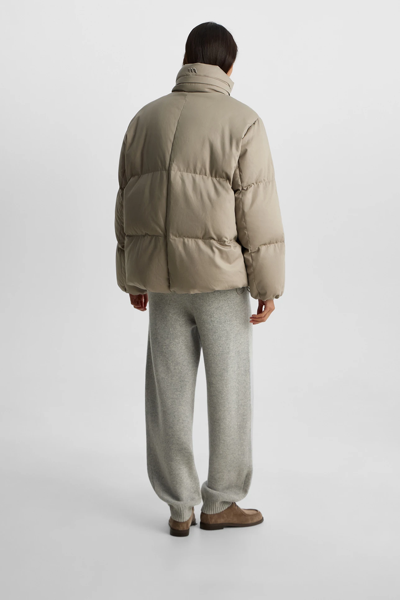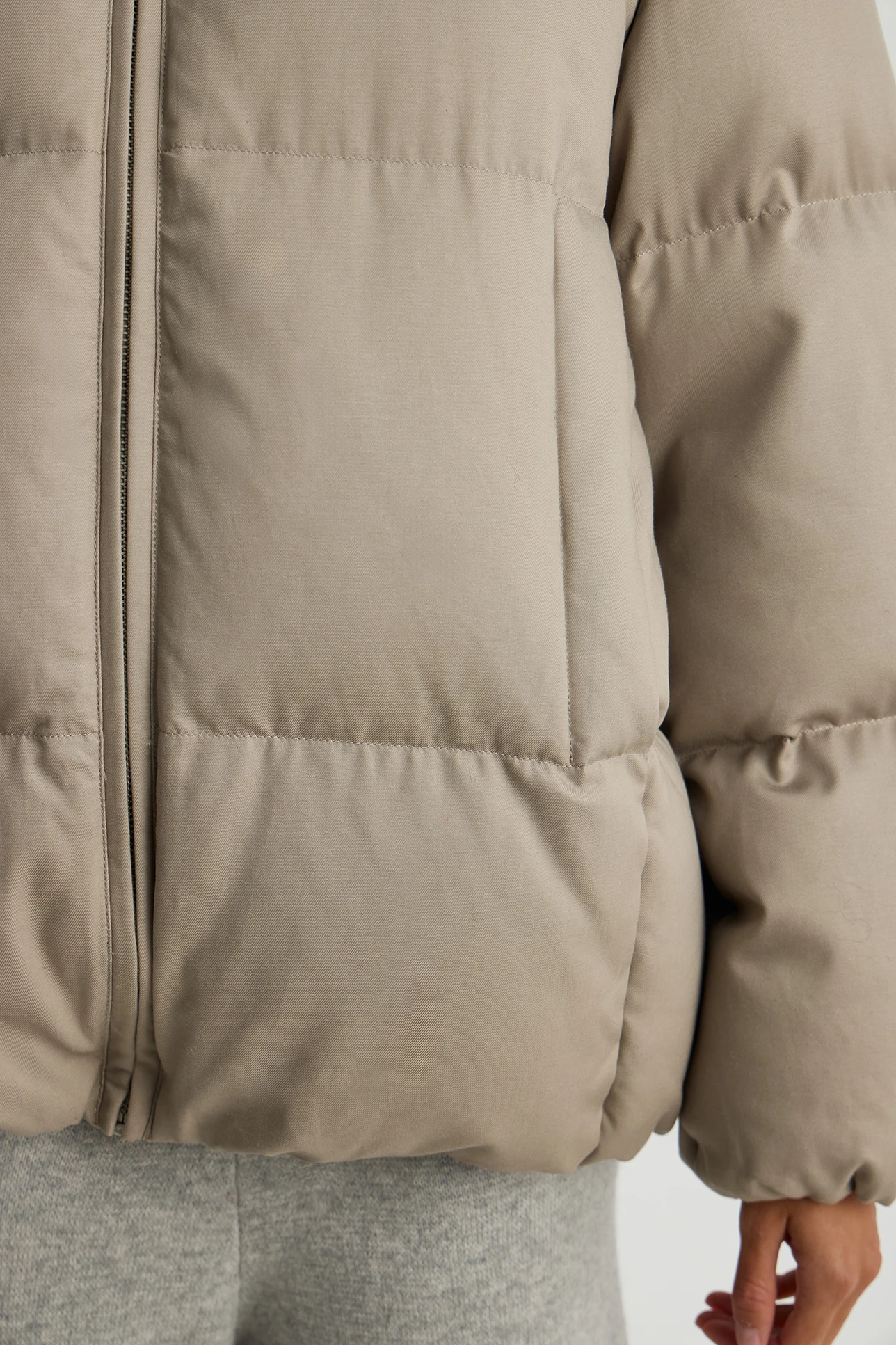 Пуховик со скрытым капюшоном серо-бежевого цвета