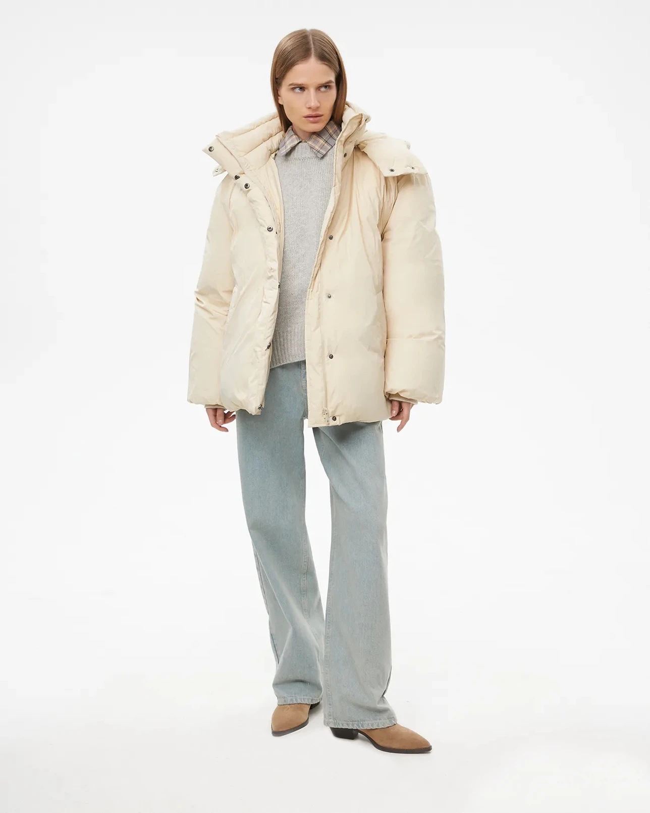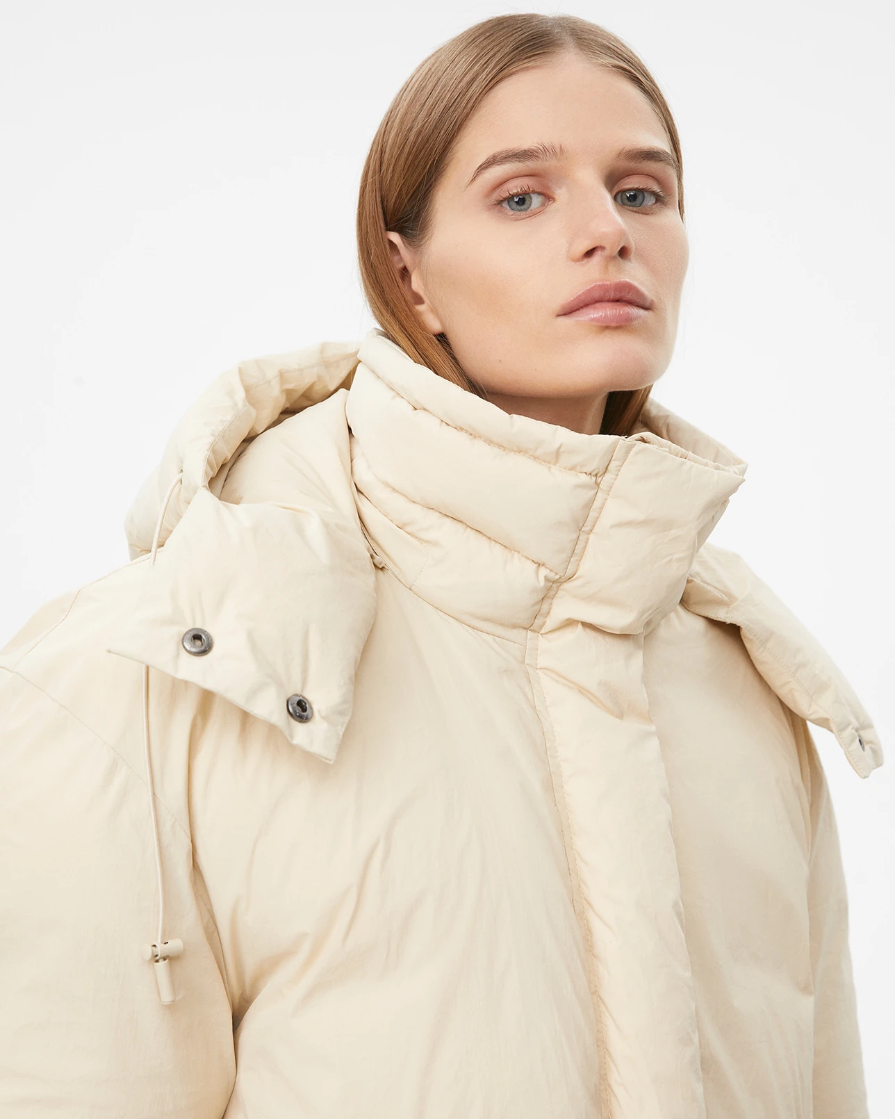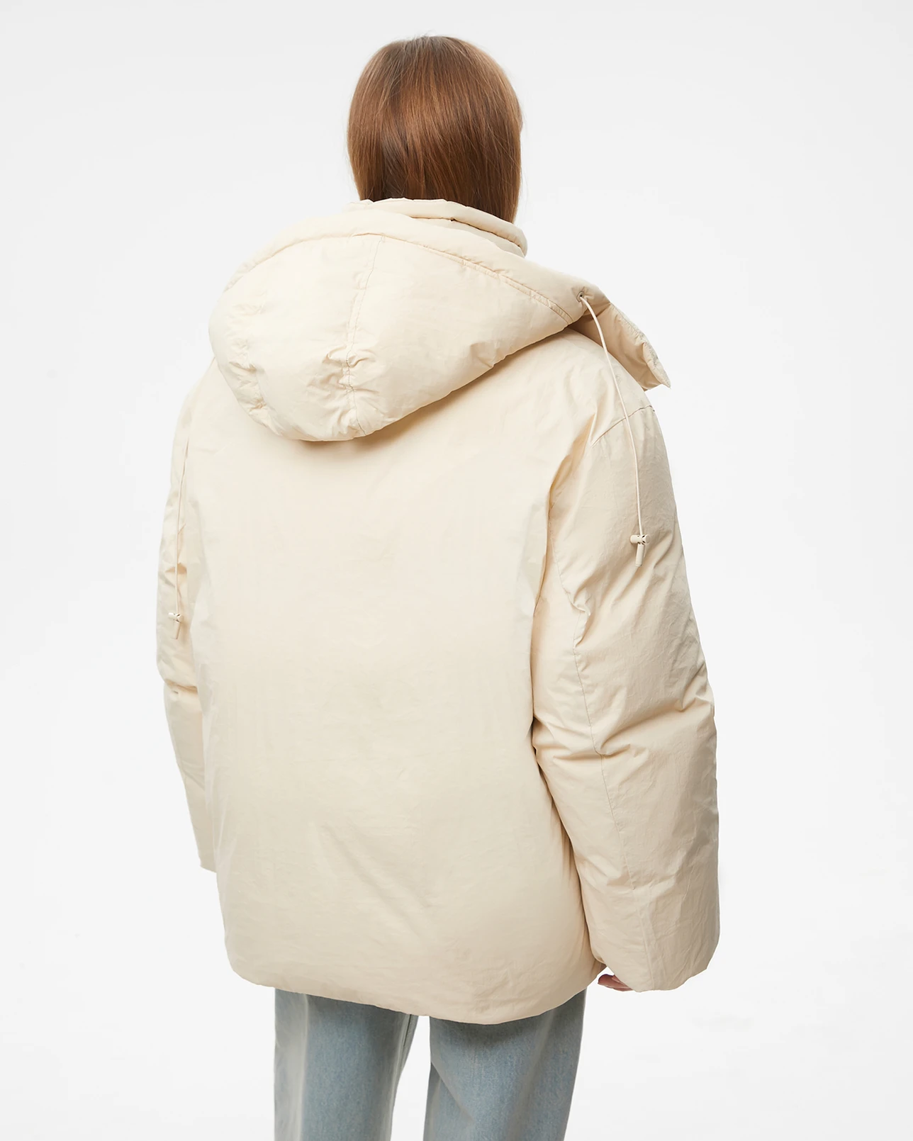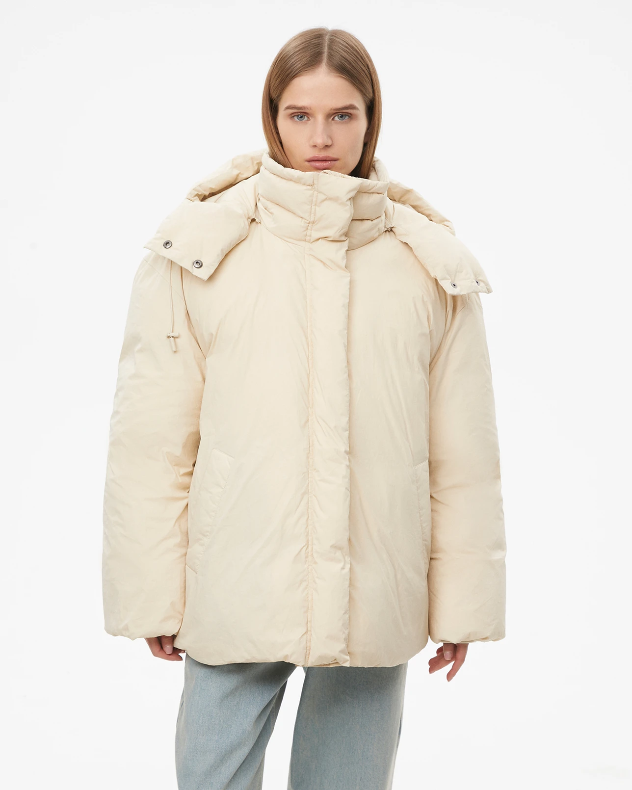 Пуховик средней длины с капюшоном молочного цвета