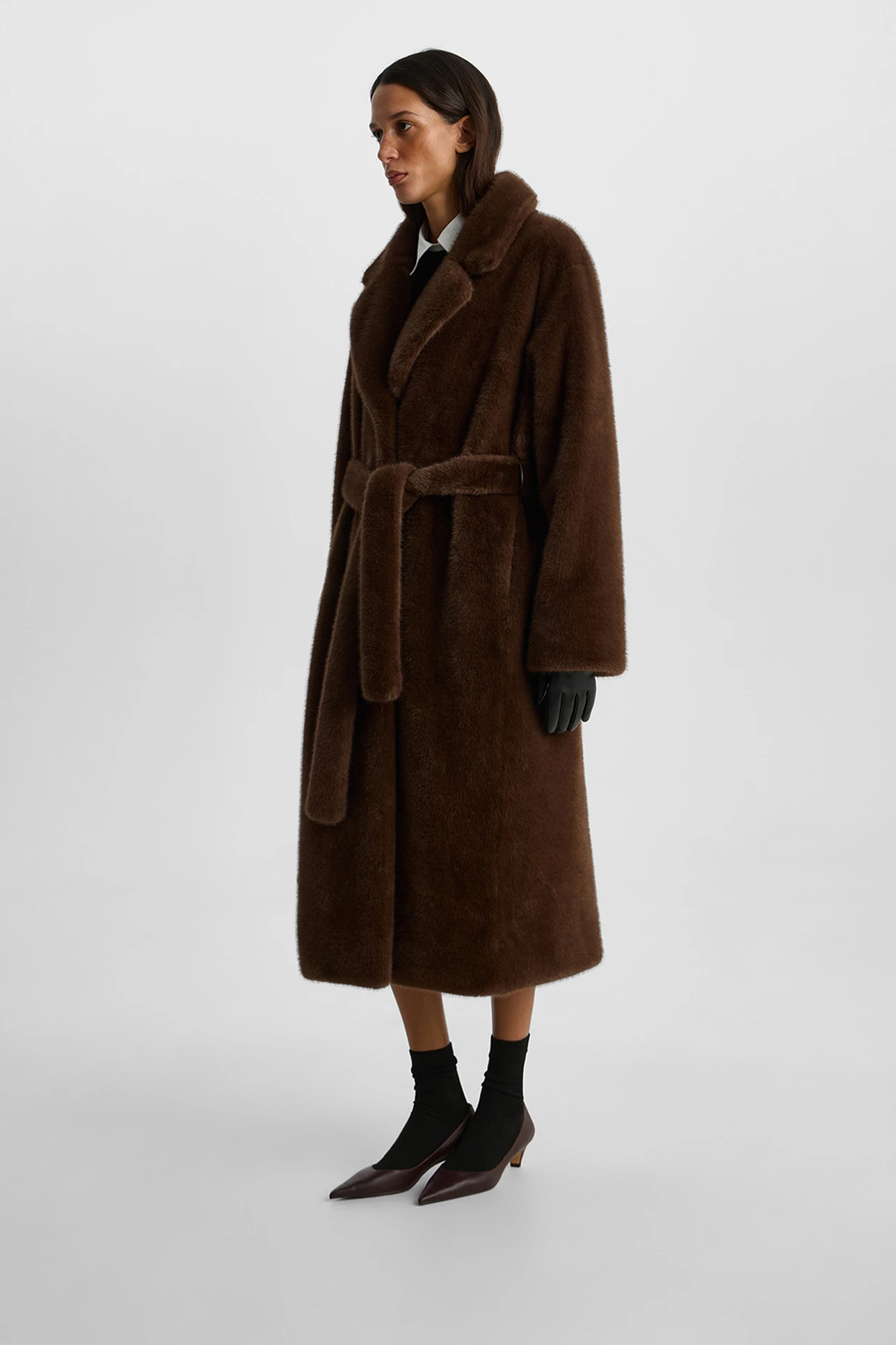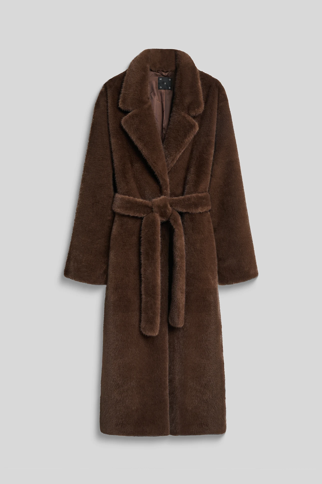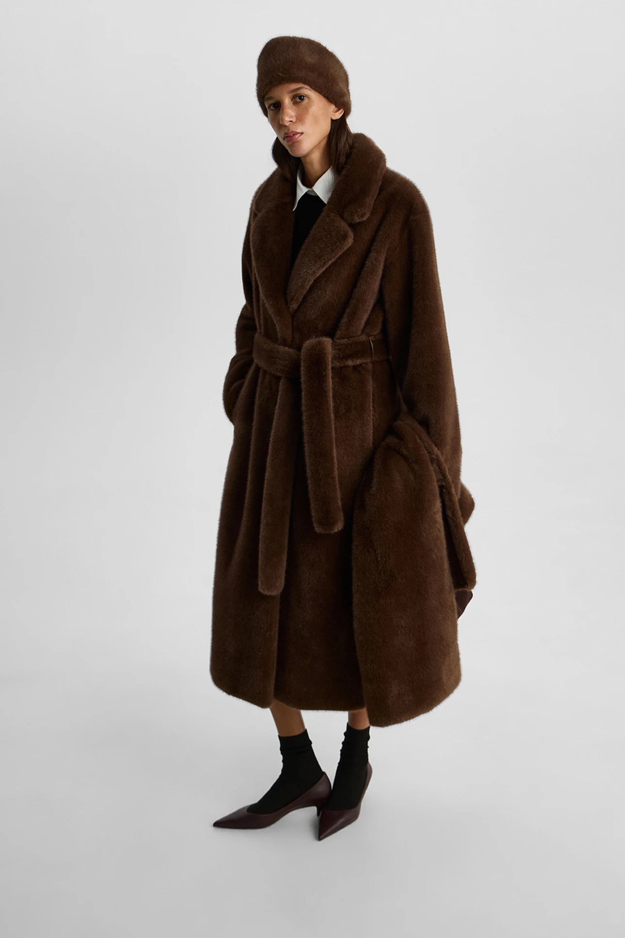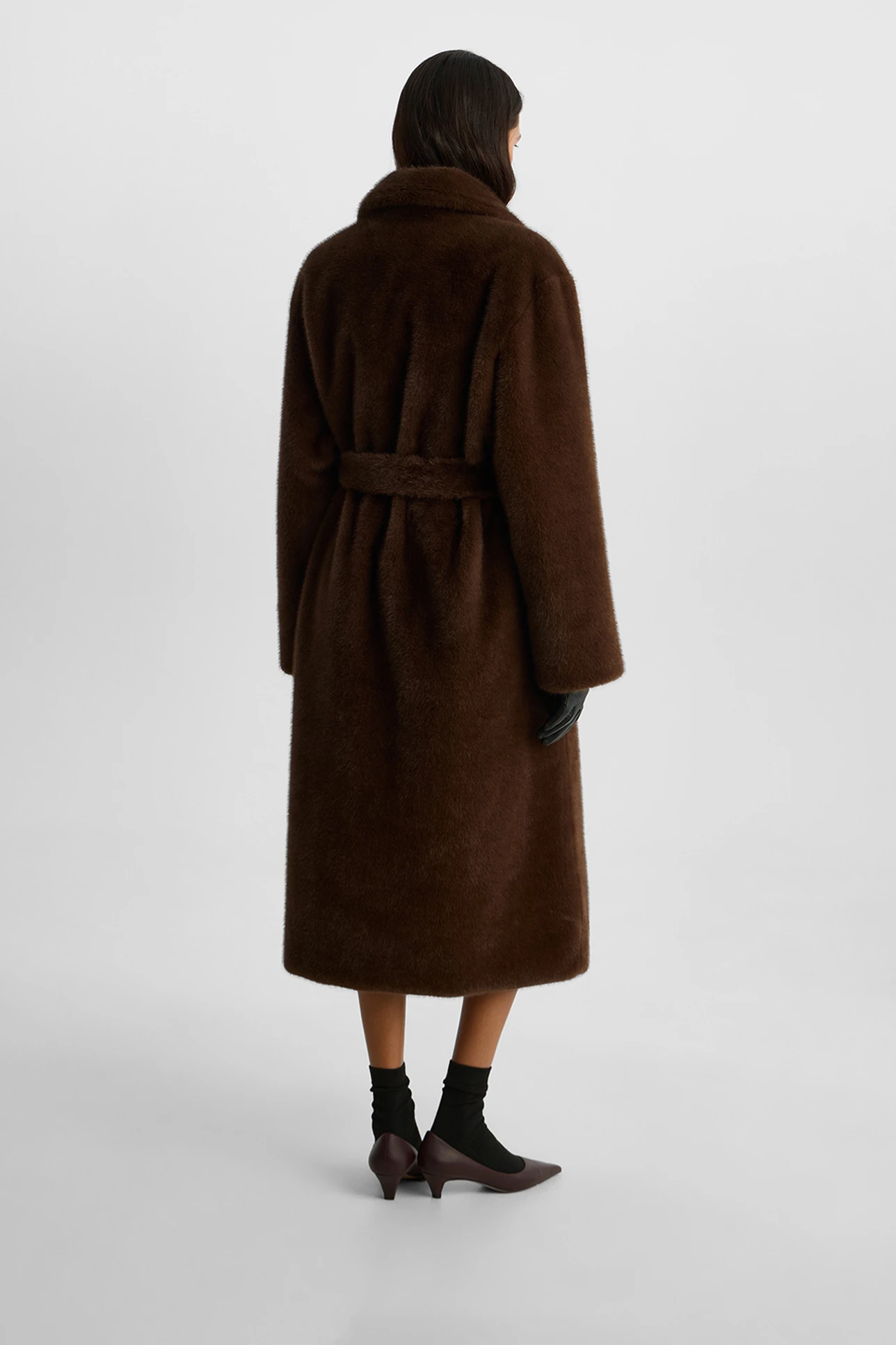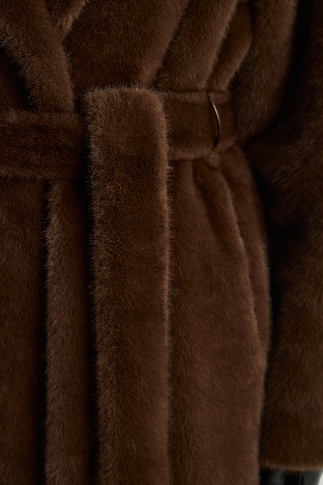 Шуба из экомеха длины макси коричневого цвета