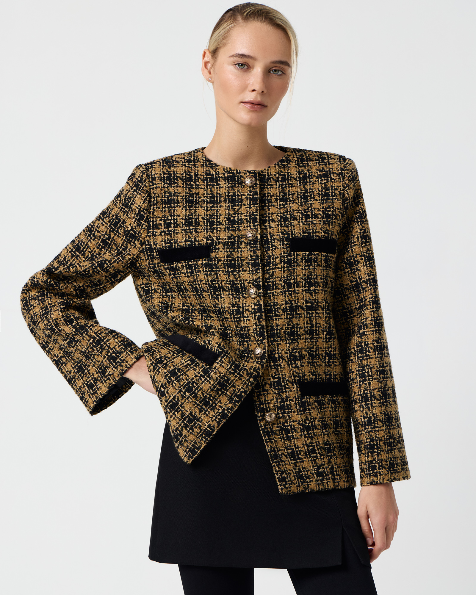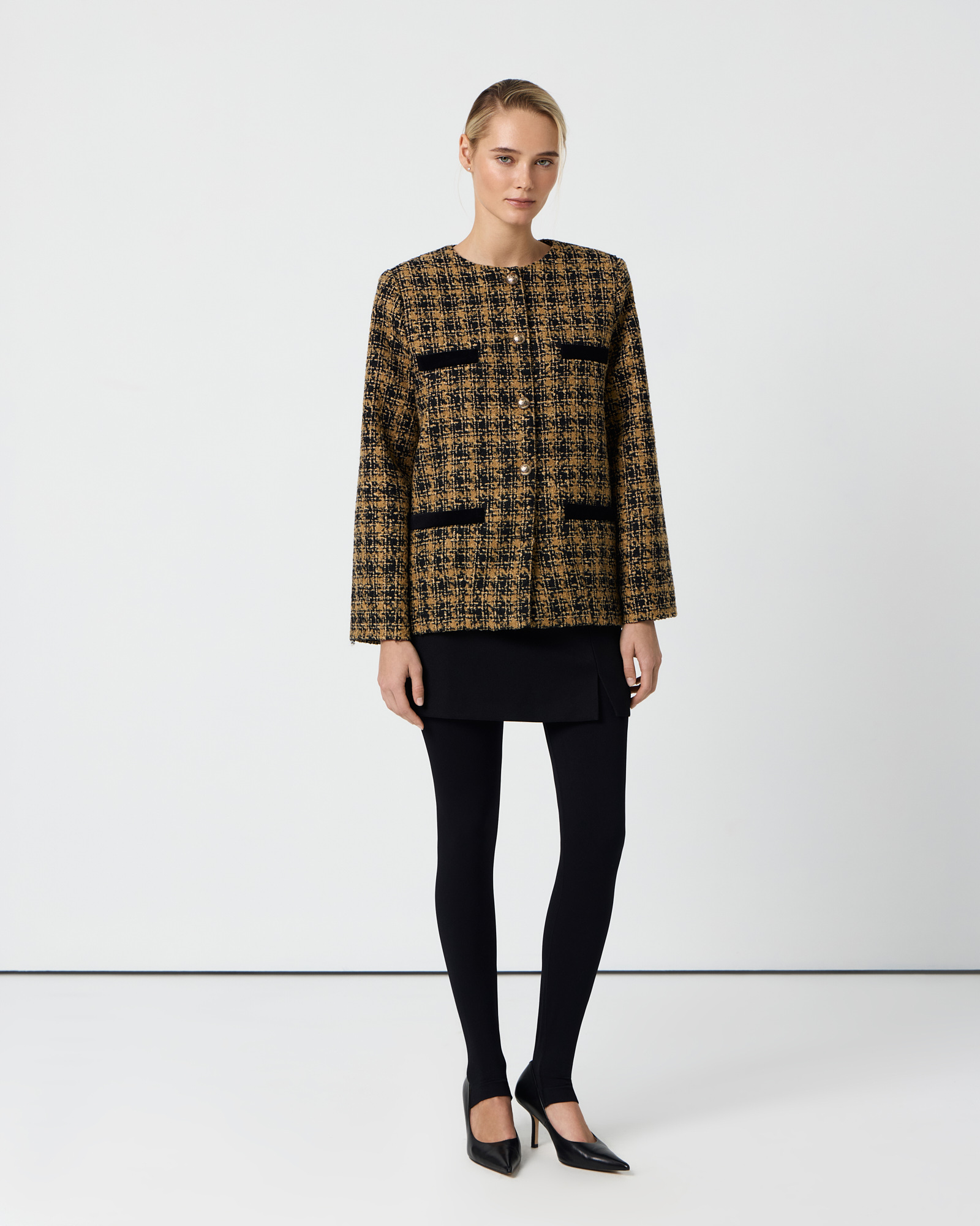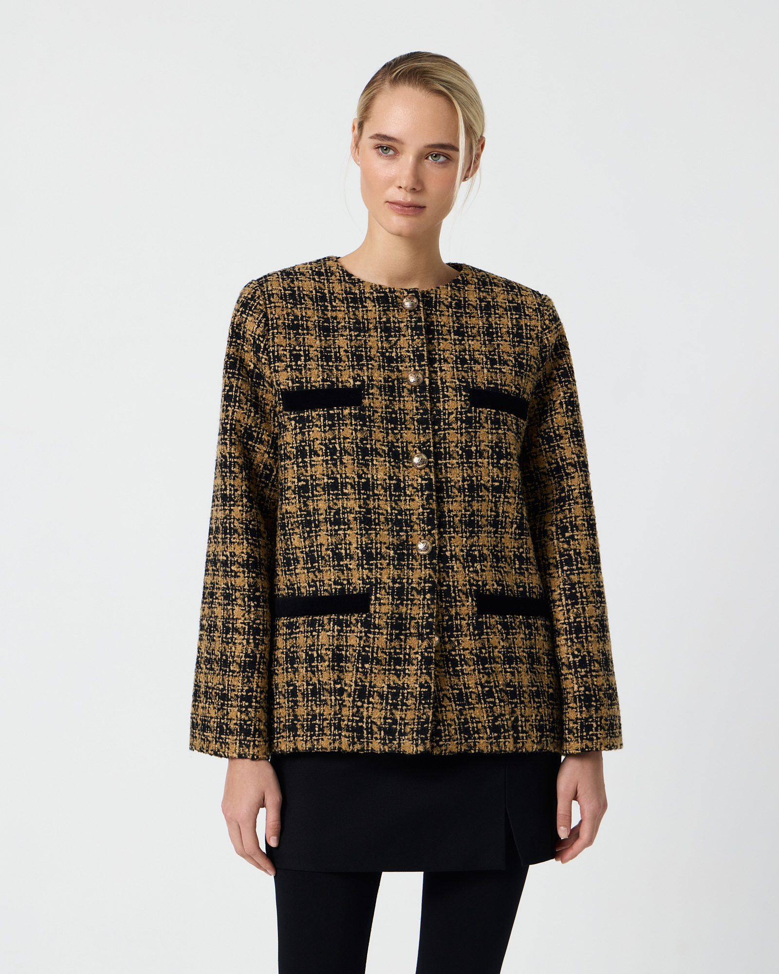 Удлиненный твидовый жакет горчичного цвета