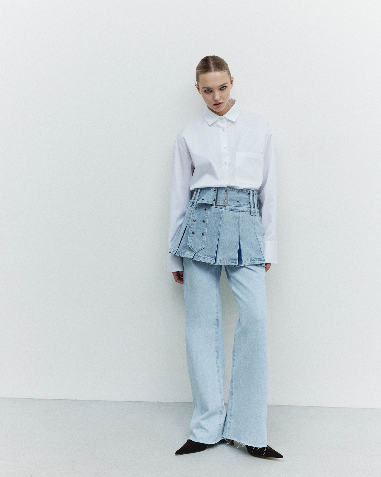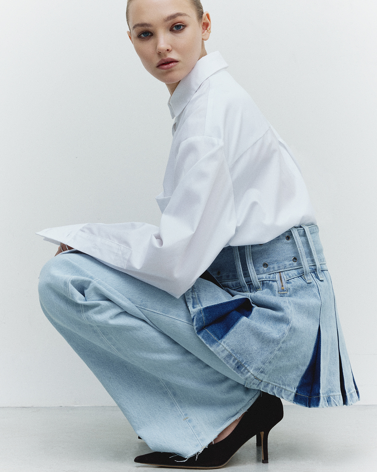 Юбка джинсовая мини со складками голубого цвета