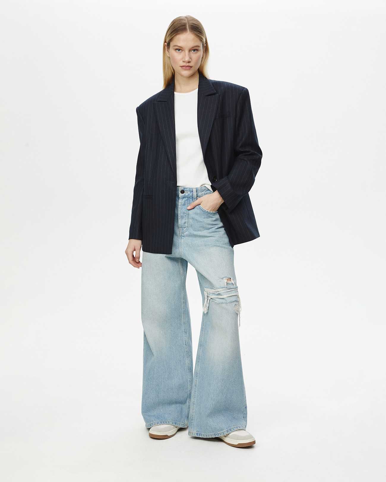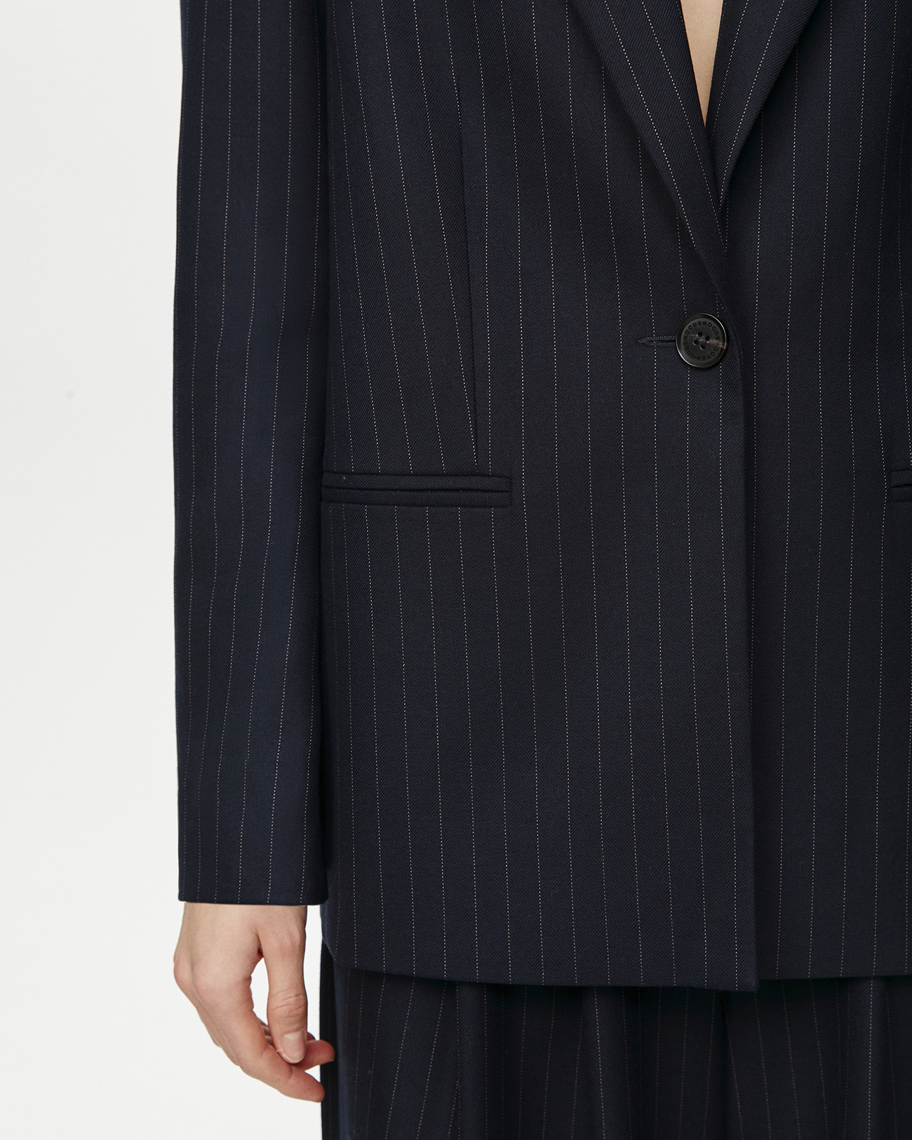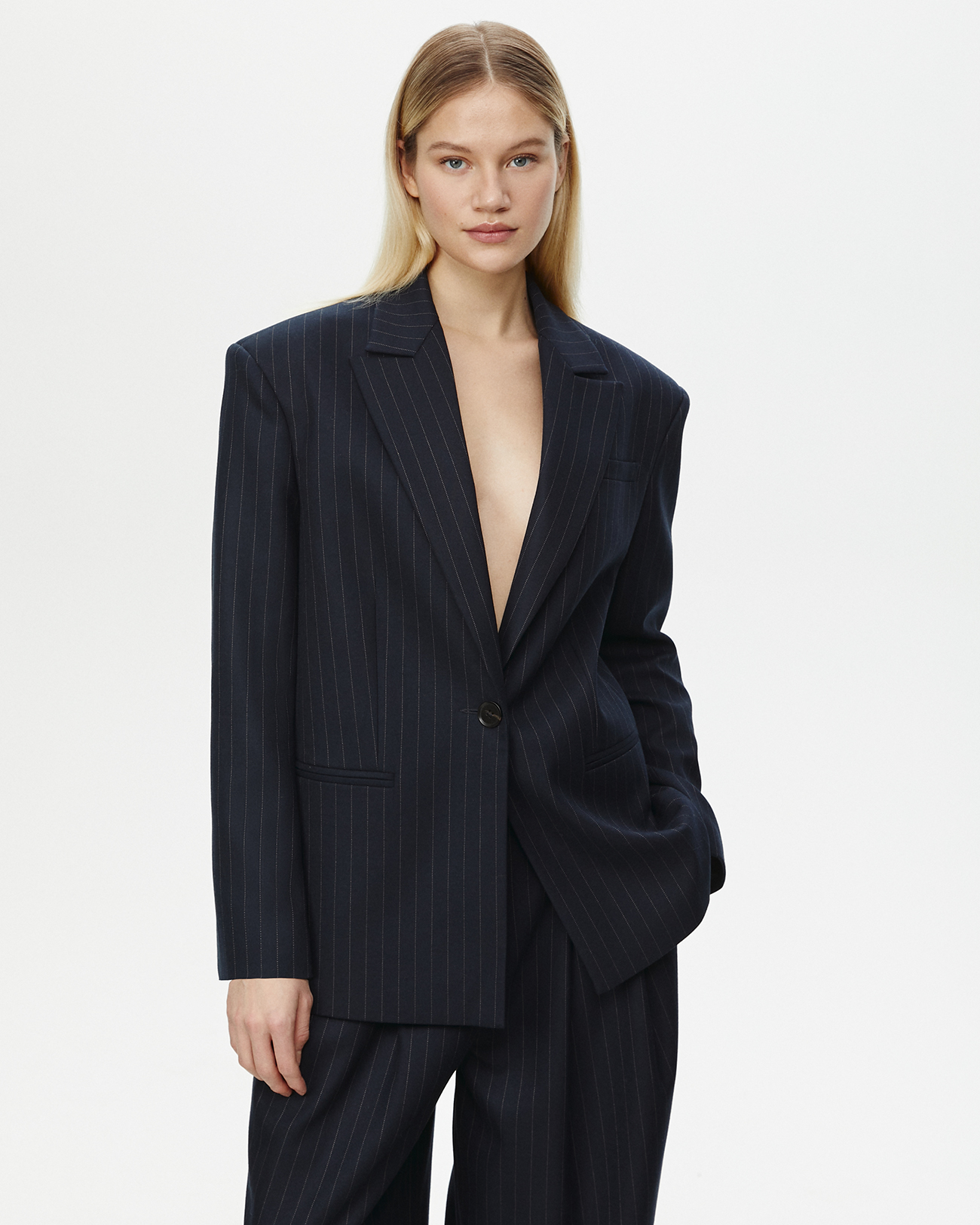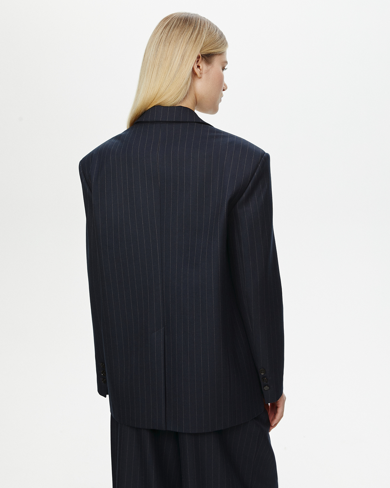 Жакет объемный в полоску темно-синего цвета