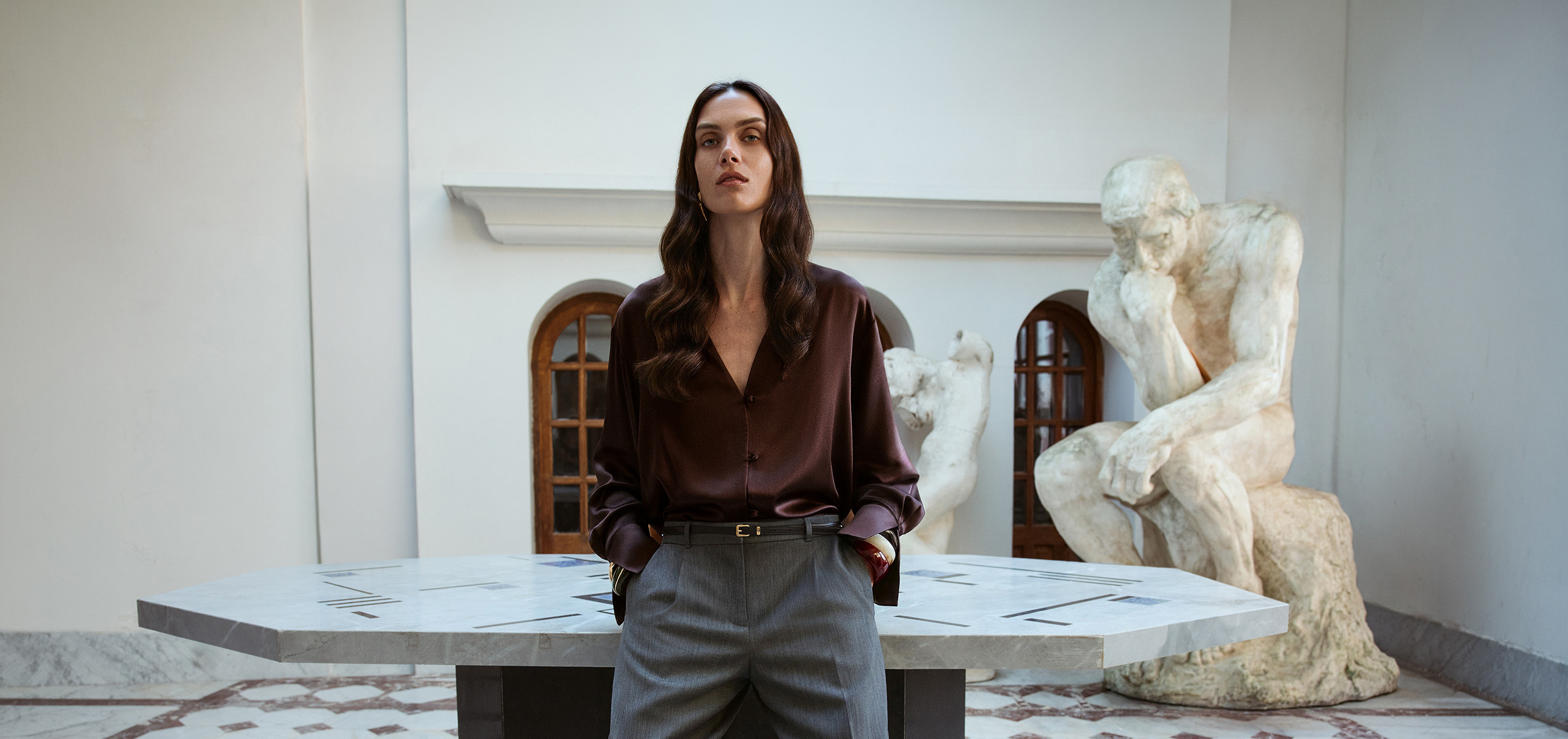 Костюмы-конструкторы из плотной шерсти, струящиеся шелковые блузы, топы и комбинации с кружевом, модели из натуральной кожи. Премиальная коллекция «Вне времени» — классика, которая востребована сегодня и актуальна всегда.